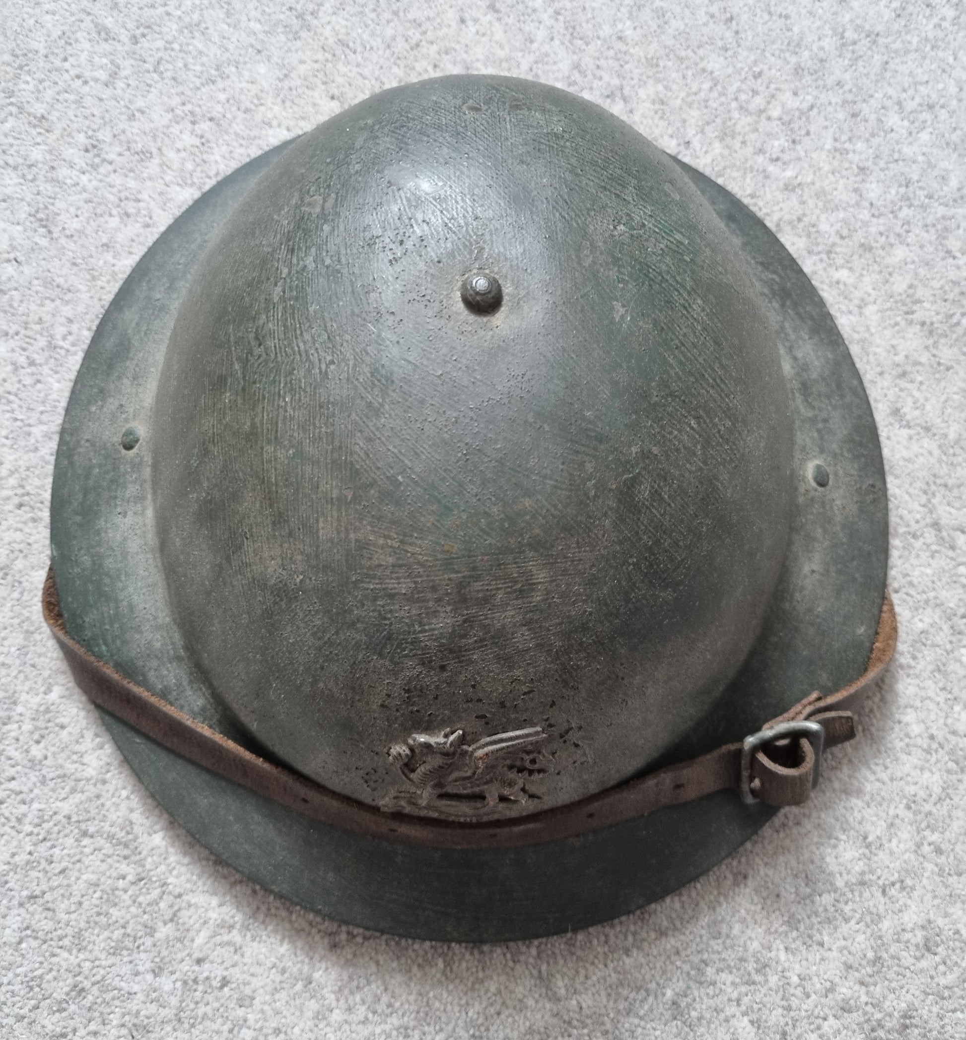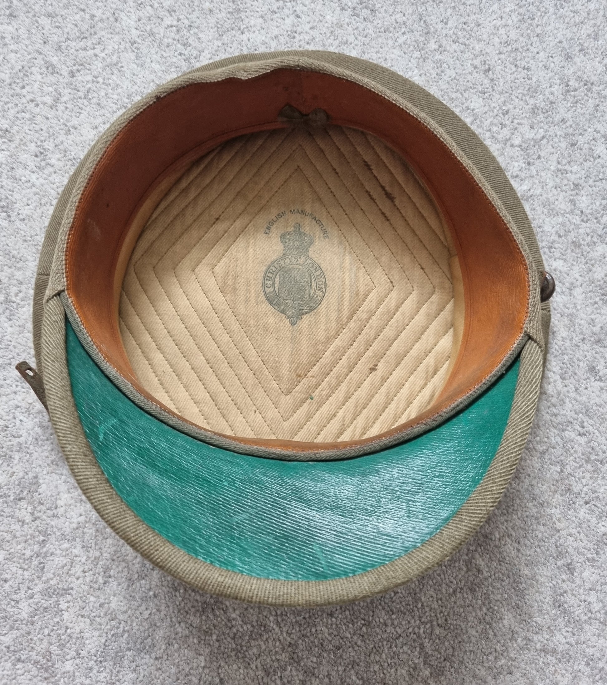 Cap condition is very good, except for one missing leather football button on the chinstrap. No mothing. Cap has a makers stamp for Christys of London.