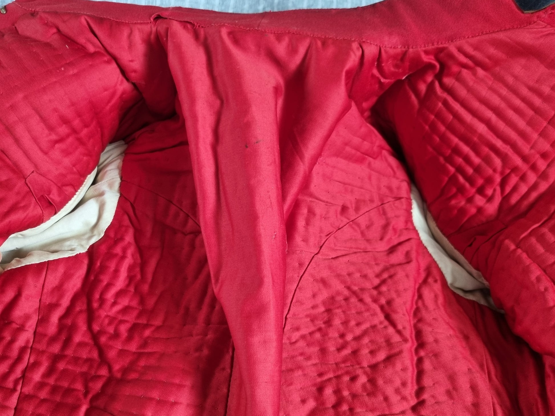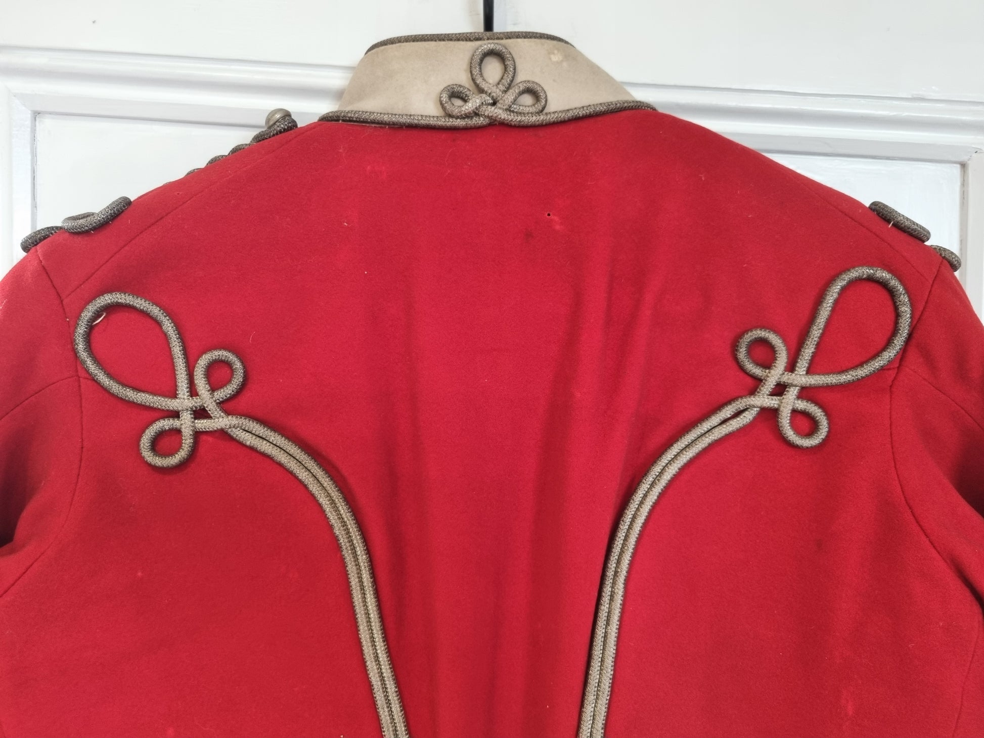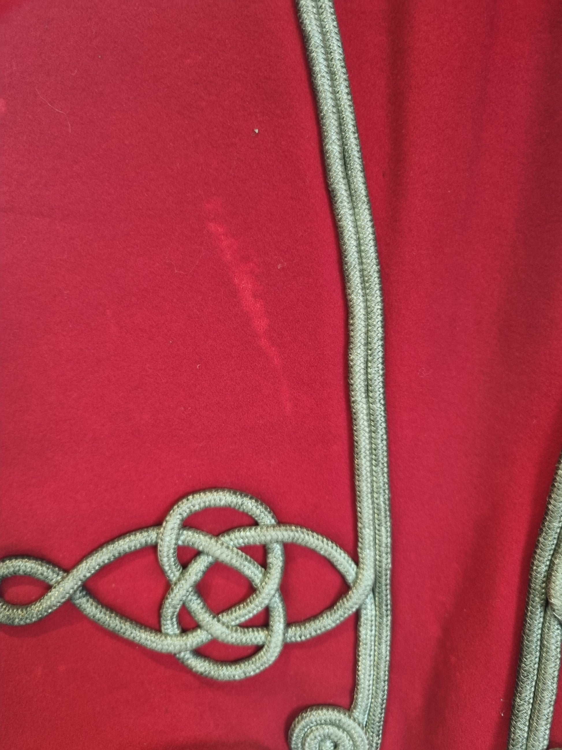 With white wool stand up collar and cuffs with silver bullion thread corded Austrian knots and frogging to the front, fastened with 21 silver plated ball buttons (one missing - there should be 22), flanked by 22 pairs of half ball buttons, with scarlet satin quilted lining