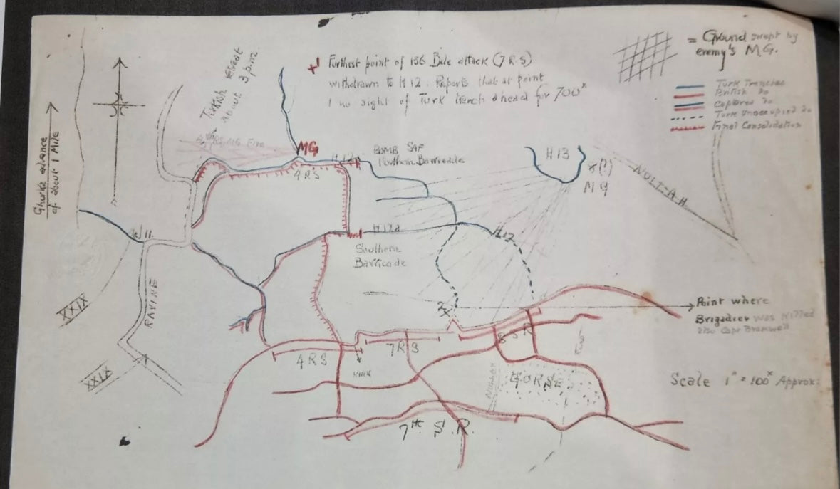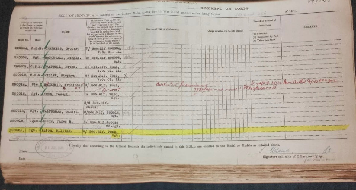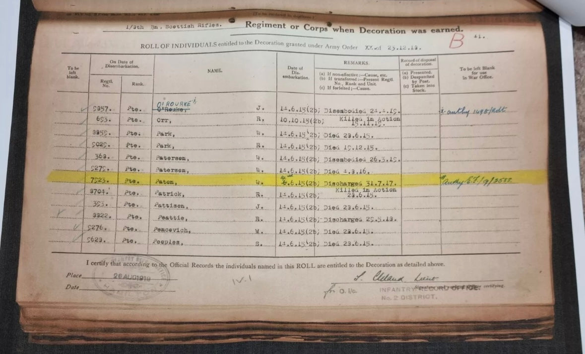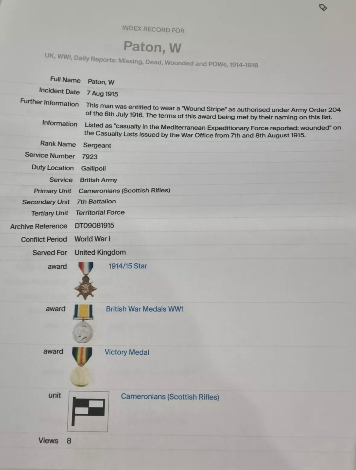 Supplied with a large amount of research material which confirms his medal awards and his wound badge award. Also includes an account of the Scottish Rifles res during the Gallipoli campaign and War diaries for the 1/8th Btn in 1915.