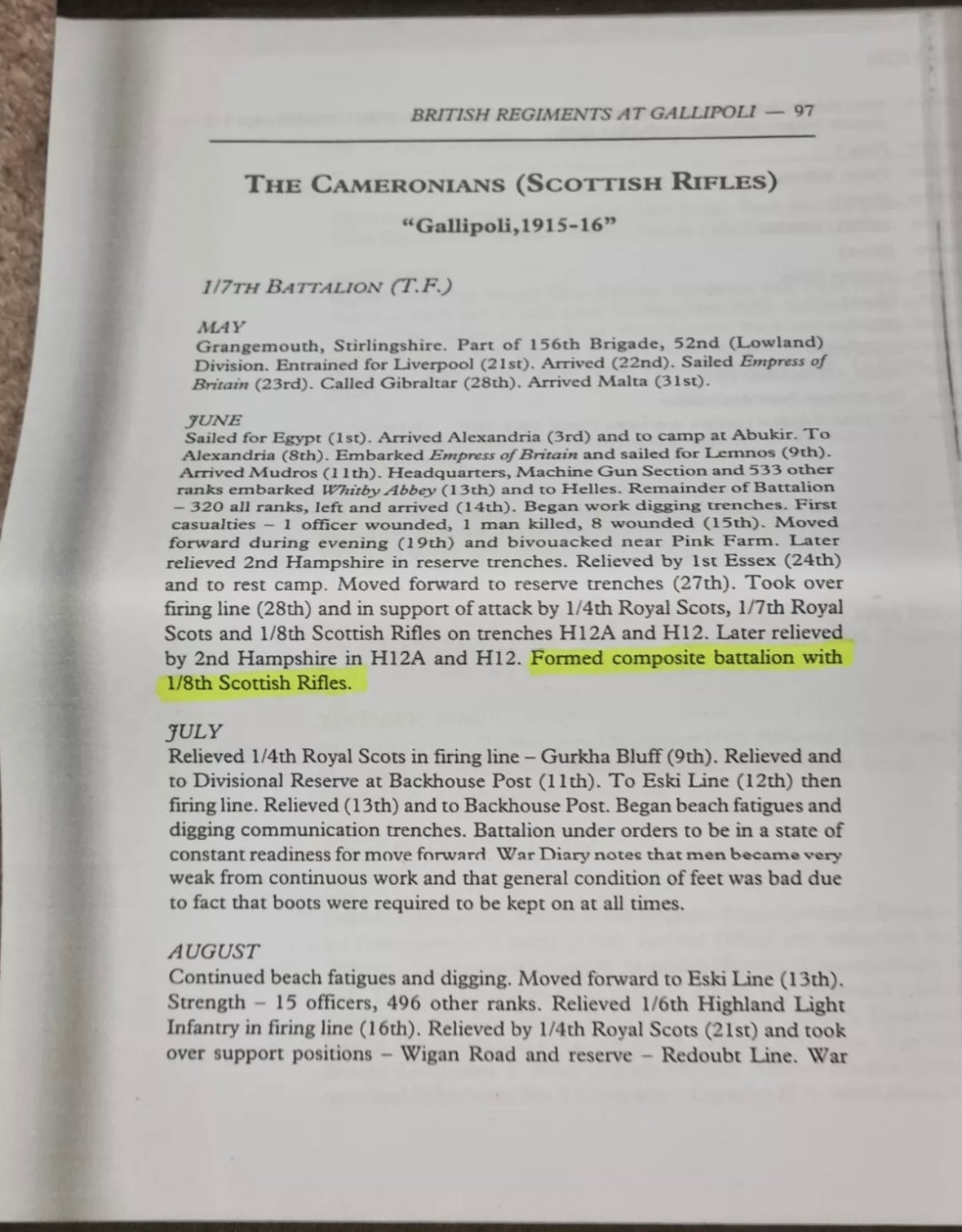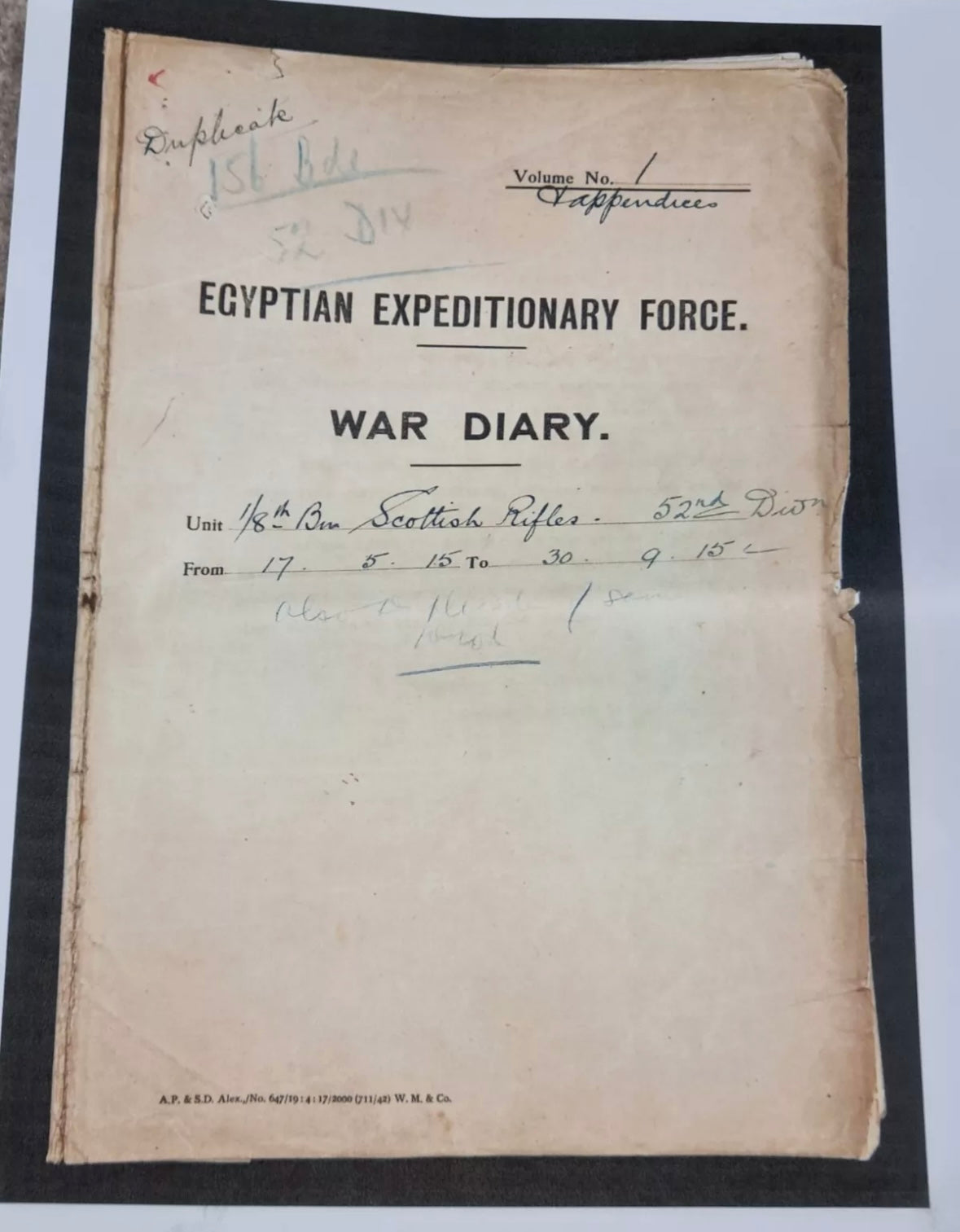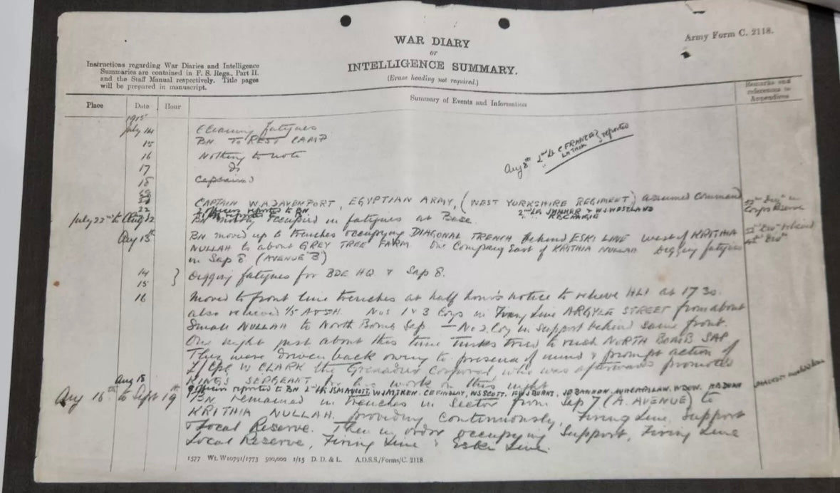 Supplied with a large amount of research material which confirms his medal awards and his wound badge award. Also includes an account of the Scottish Rifles res during the Gallipoli campaign and War diaries for the 1/8th Btn in 1915.