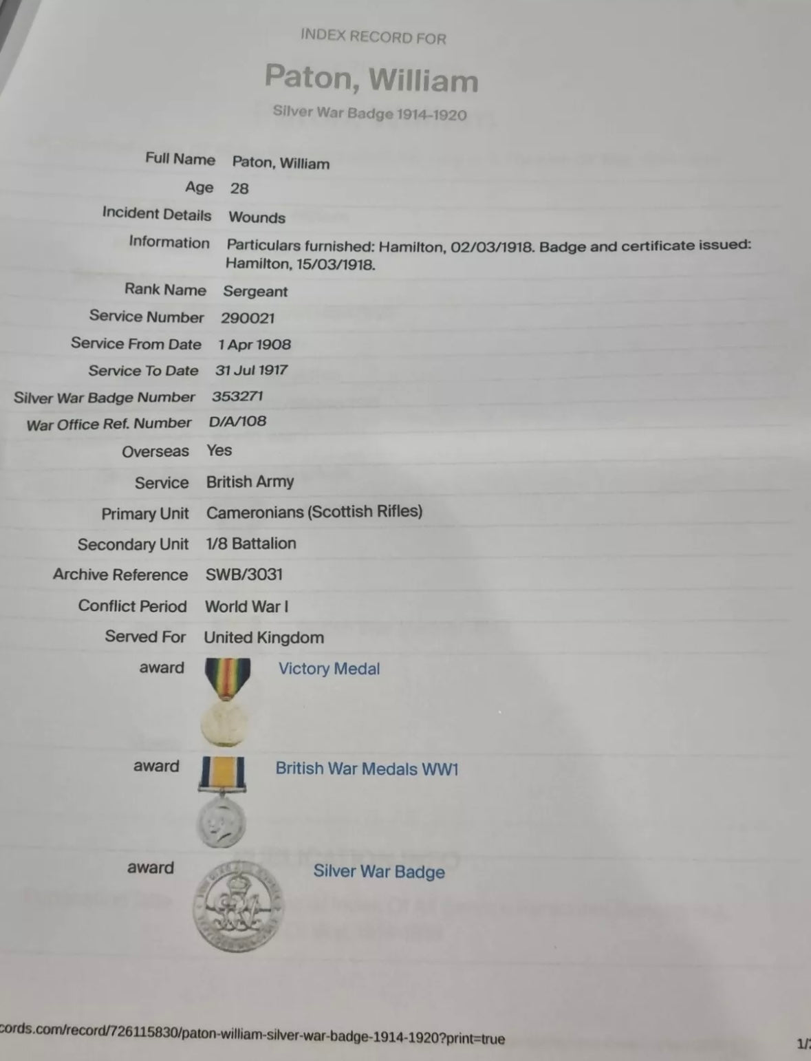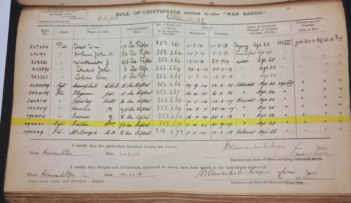 He enlisted on 1st April 1908 and initially served in the 7th Btn The Cameronians (Scottish Rifles) under service number 7923.
