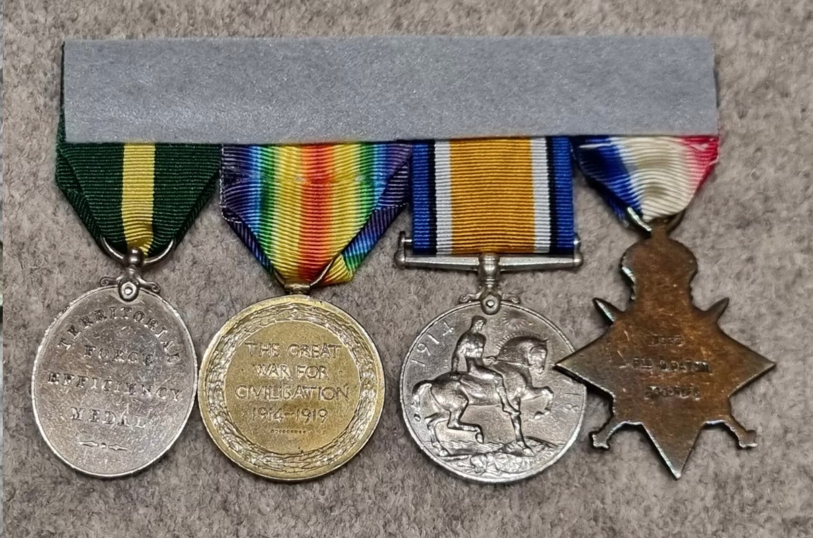 A mounted British WW1 & Territorial Efficiency 4 Medal Group to Sergeant William Paton, who was wounded in action in 1915 at Gallipoli, and again 1916 and was awarded a Silver Wound Badge.