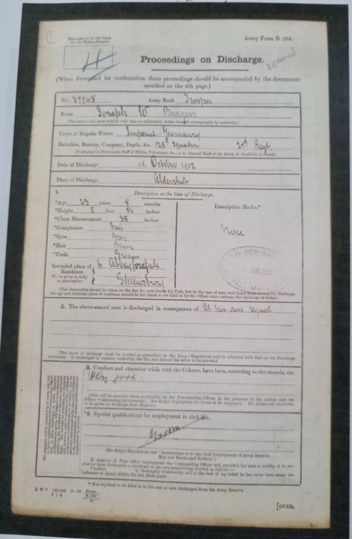 Supplied with many pages of research materials from both his Boer War and WW1 service, including some photocopied photos, War Diary entries for the period of the battle in which he was wounded and a photocopied map of the troop formations involved in the battle