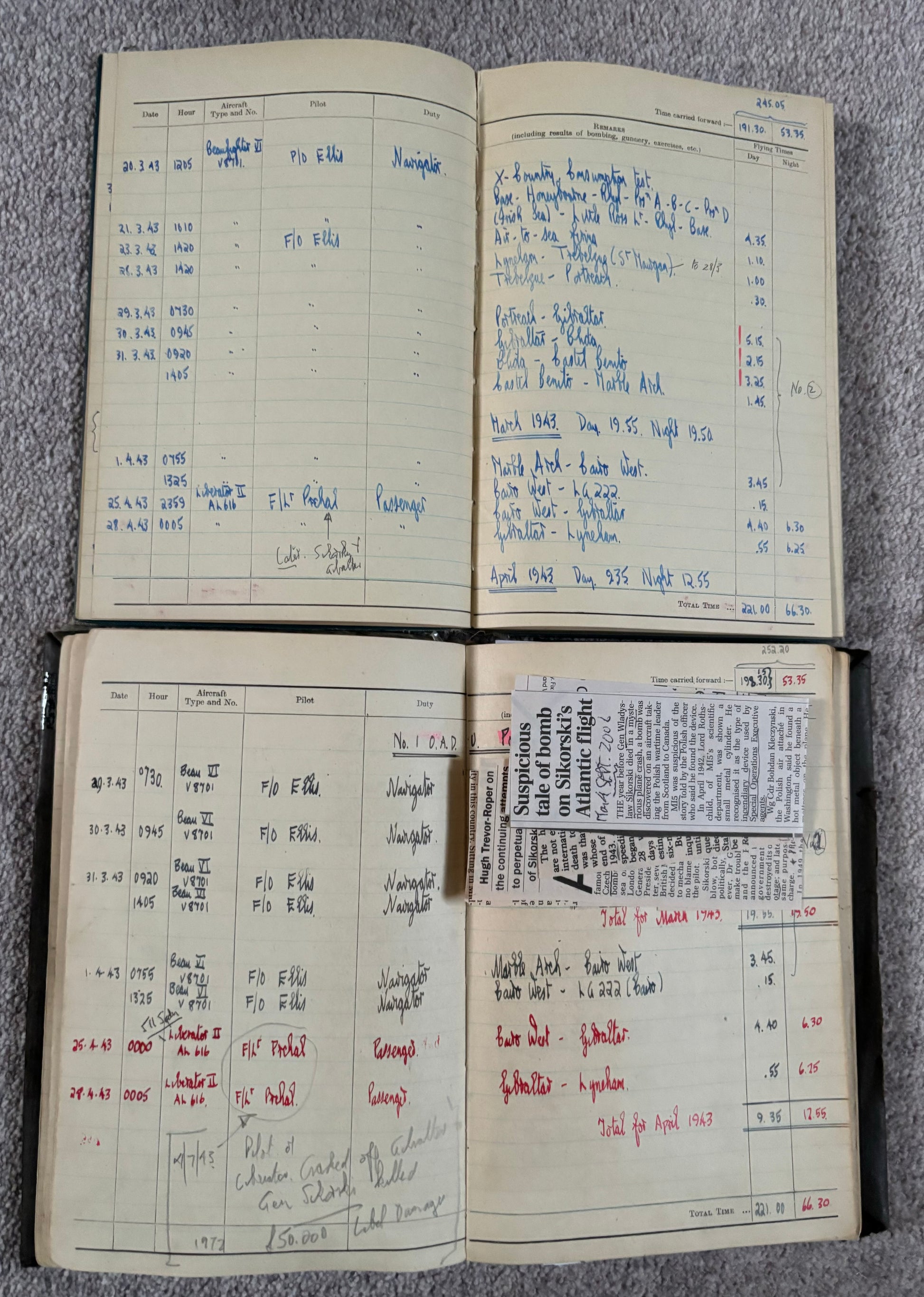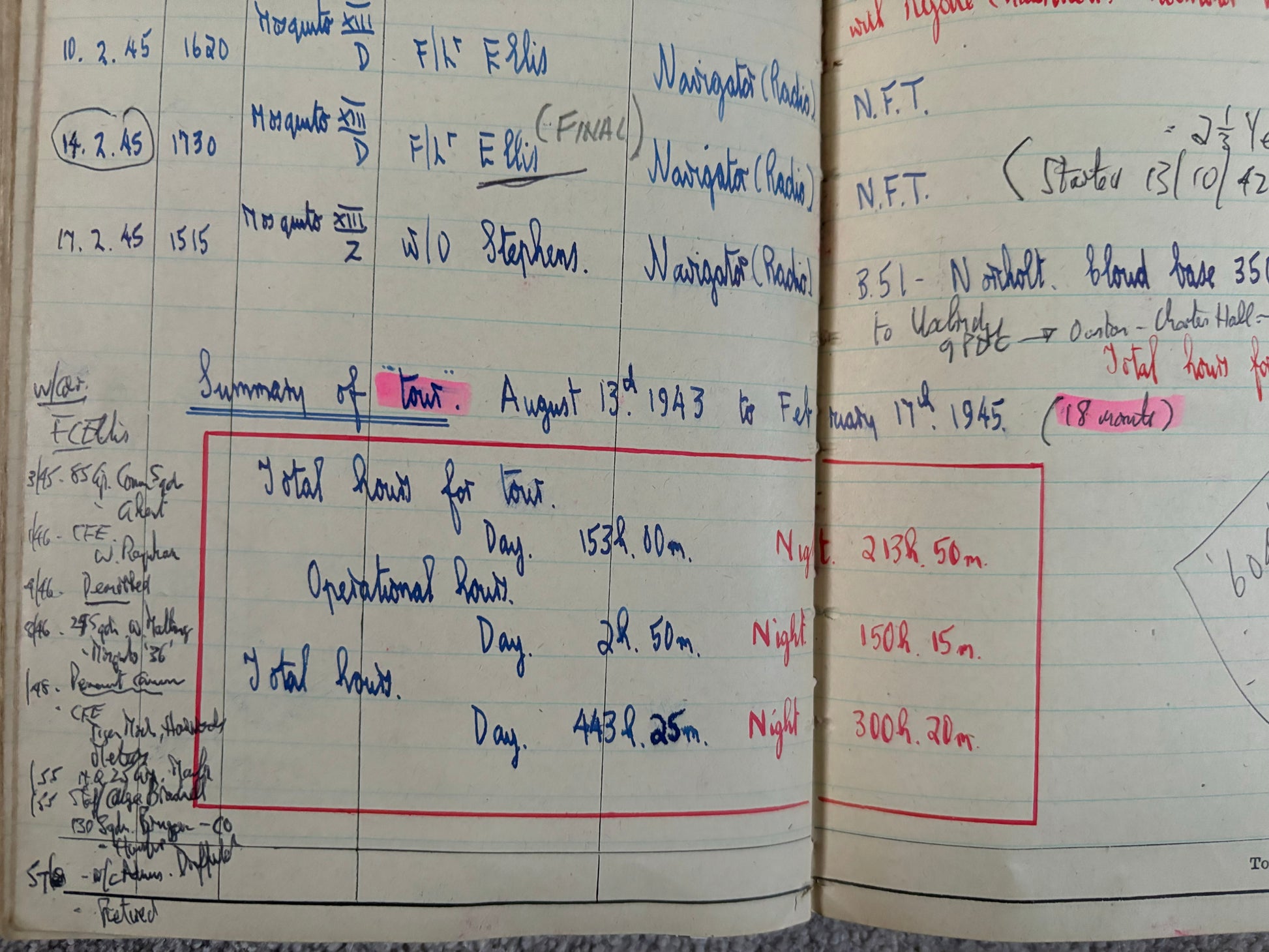 · Two original logbooks, named to Williams, containing his entire career from early training, to his time as a nightfighter, to working as an instructor in mid 1945. It is important to stress these two logbooks contain the same details and are copies of each other, one being the official version, and the other private version with lots of annotations, cutouts and extra details not contained within the more brief official version. It should be mentioned the spine of the unofficial version has been poorly repaired, but is still very much readable. The logbooks over 153.05 operational hours as a nightfighter (13/8/43- 17/2/45), including 63 night fighter sorties, and 743.45 hours total. They include flights on D-Day, the Battle of the Bulge, Operation Neptune, many close calls and two confirmed kills. They really are quite special.