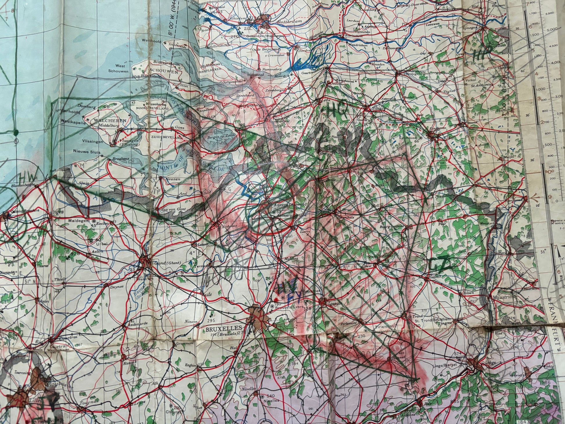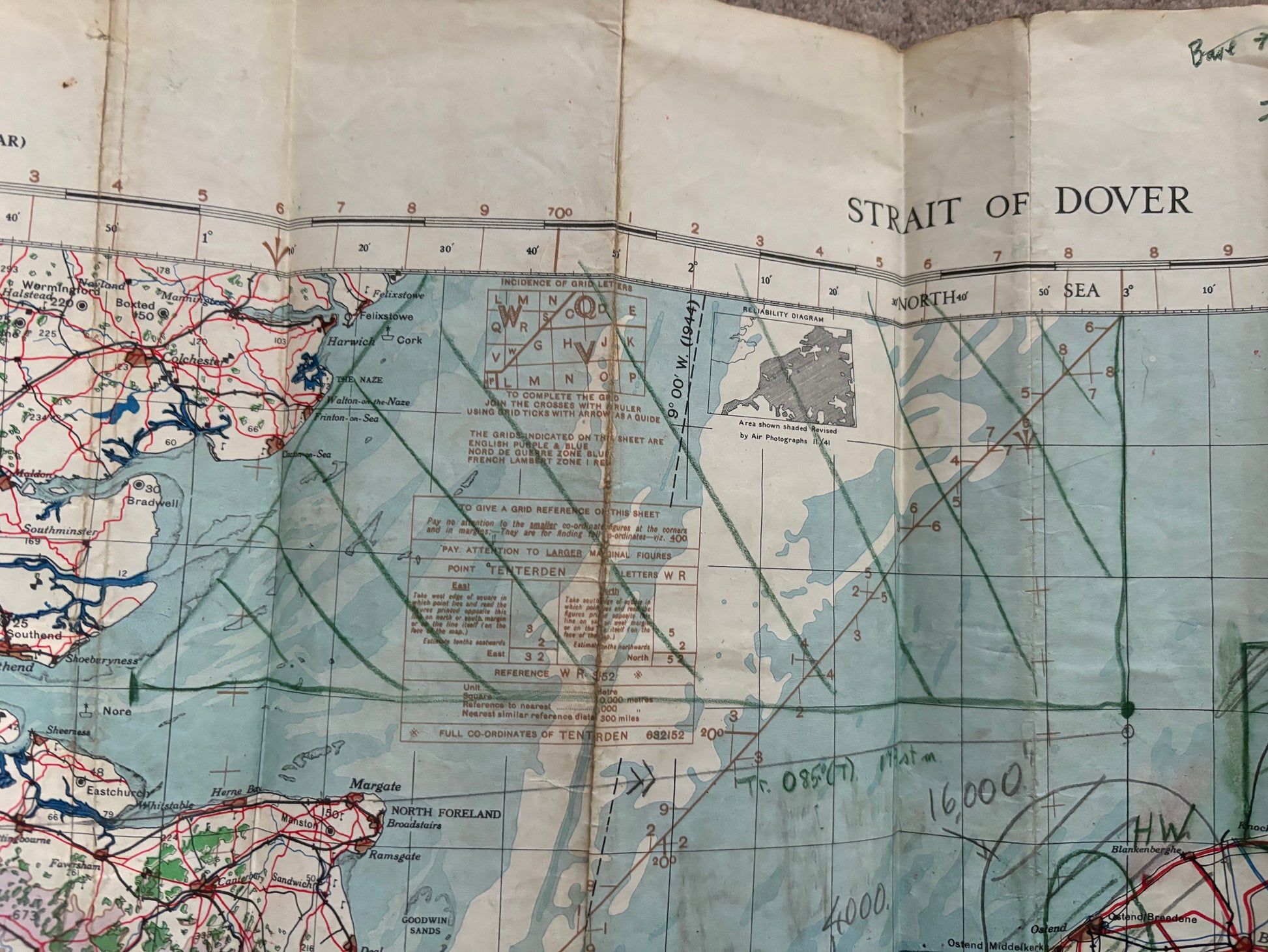 · 15 operationally marked navigators RAF issue silk backed maps named to Williams. These maps have bearings, no fly zones, heights and other hand drawn annotations, and were the very maps Williams used during operations. One map, with a route marked to Amiens, as well as frontlines in the Netherlands, was likely used during his 4/11/44 Amiens patrol as well as later mission under Voicebox, Avalon and Rejoice. The maps range from Scotland, Wales, Irish Sea, England, The Channel, Belgium/Netherlands and the French Coast. All maps except one are in good condition (One has been repaired and is somewhat fragile).