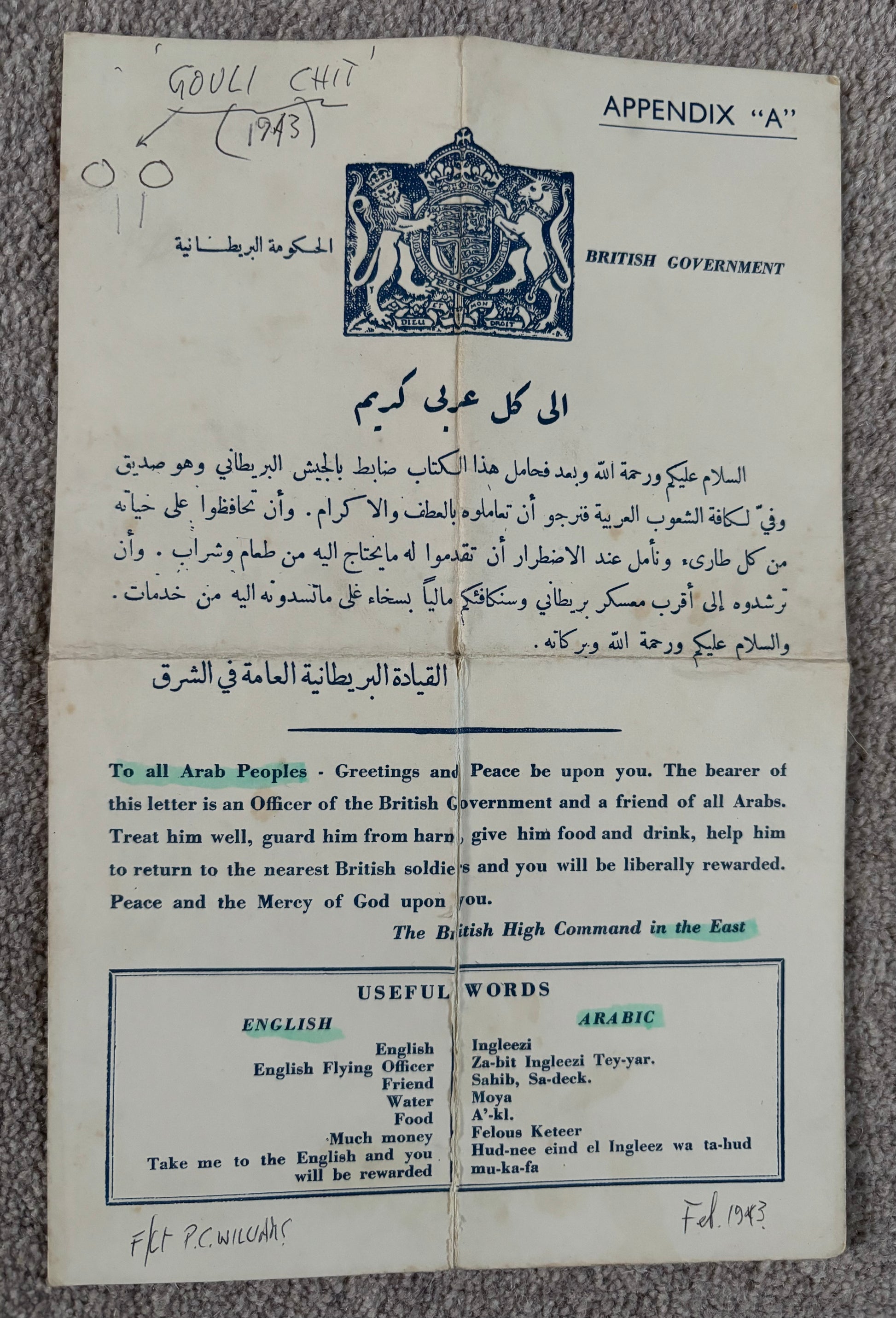 · A rare original linen backed ‘Gouli Chit’, handout issued to Williams in February 1943, featuring translations into Arabic reading: “To all Arab Peoples. Greetings and peace be upon you. The bearer of this letter is an Officer of the British Government and a friend of all Arabs. Treat him well, guard him from harm, give him food and drink, help him to return to the nearest British soldiers and you will be liberally rewarded. Peace and mercy of God upon you. The British High Command in the East.”