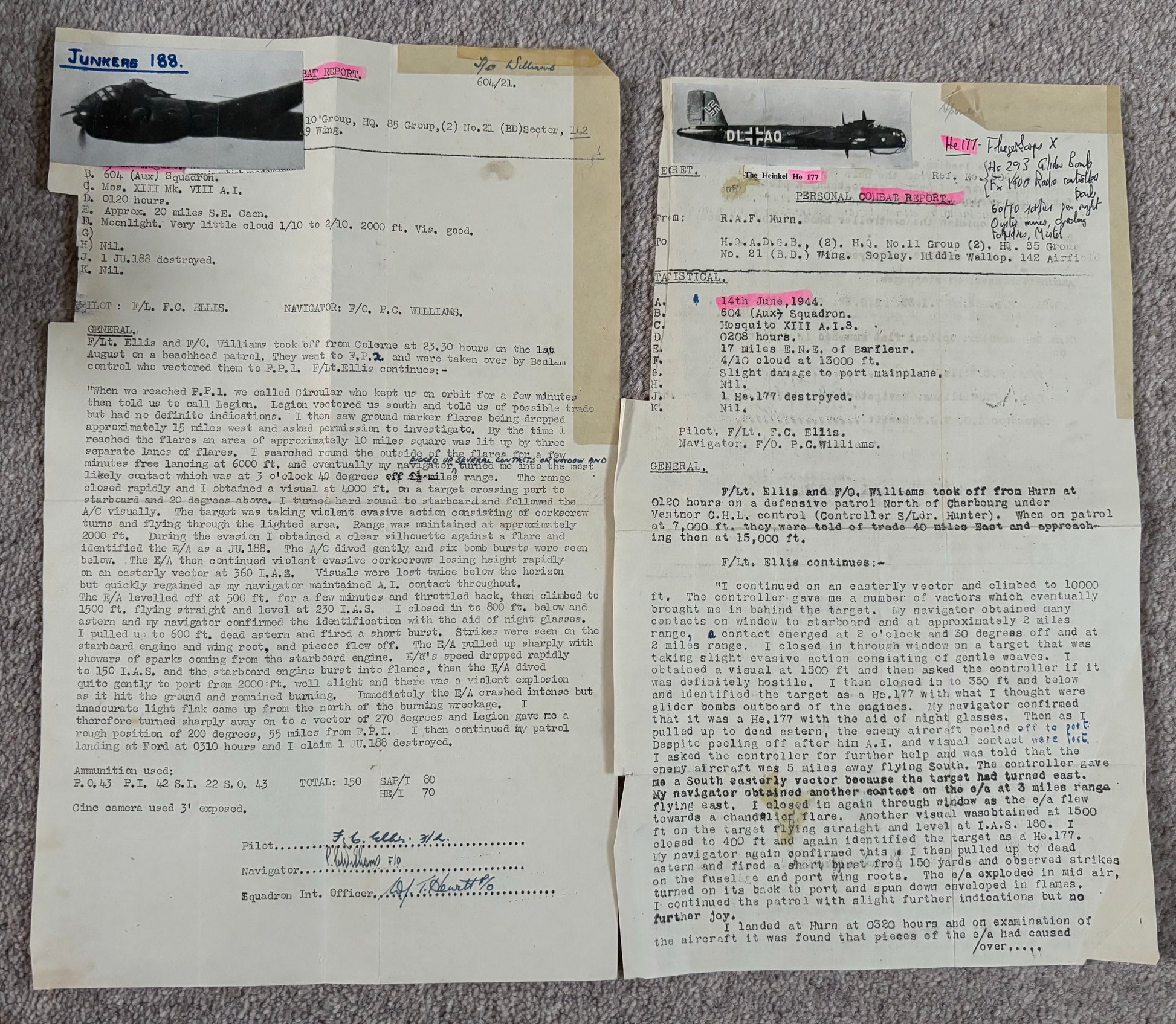 “F/Lt Ellis and F/O Williams took off from Hurn at 01:20 hours on a defensive patrol north of Cherbourg under Ventnor CHL control (Controller S/Ldr Hunter). When on patrol at 7,000ft they were told of trade 40 miles East and approaching then at 15,000ft, F/Lt Ellis continues: ‘I continued on an easterly vector and climbed to 10,000ft. The controller gave me a number of vectors which eventually brought me in behind the target. My navigator obtained many contacts on window to starboard and at approximately 2 miles range a contact emerged at 2 o'clock and 30 degrees off and at 2 miles range. I closed in through window on a target that was taking slight evasive action consisting of gentle weaves. I obtained a visual at 1500 it and then asked the controller if it was definitely hostile. I then closed in to 350 ft and below and identified the target as a He177 with what I thought were glider bombs outboard of the engines. My navigator confirmed that it was a He177 with the aid of night glasses. Then as I pulled up to dead astern, the enemy aircraft peeled off to port. Despite pulling off after him A.I. and visual contact were lost. I asked the controller for further help and was told that the enemy aircraft was 5 miles away flying South. The controller gave me a south easterly vector because the target had turned east. My navigator obtained another contact on the e/a at 3 miles range flying east. I closed in again through window as the e/a flew towards a chandelier flare. Another visual was obtained at 1500ft on the target flying straight and level at I.A.S. 180. I closed to 400 ft and again identified the target as a He.177. My navigator again confirmed this. I then pulled up to dead astern and fired a short burst from 150 Yards and observed strikes on the fuselage and port wing roots. The e/a exploded in mid air, turned on its back to port and spun down enveloped in flames. I continued the patrol with slight further indications but no further joy. I landed at Hurn at 03:20 hours and on examination of the aircraft it was found that pieces of the e/a had caused damage to the leading edge of the port mainplane. Pieces of Perspex were removed from the main plane and in the radiation were found pieces of German astrograph, a piece of blue grey fabric and strips of window. In my opinion the controller handled the interception perfectly. I clam 1 He177 destroyed.’”