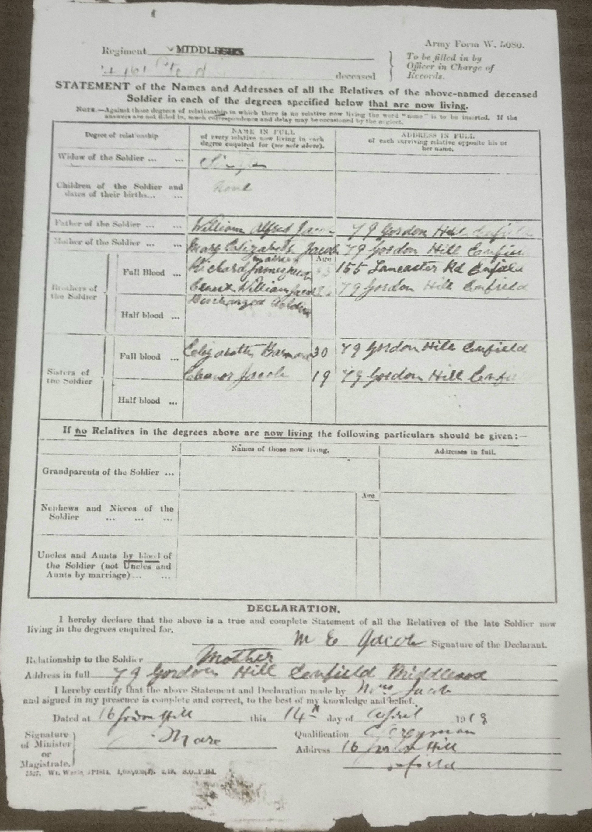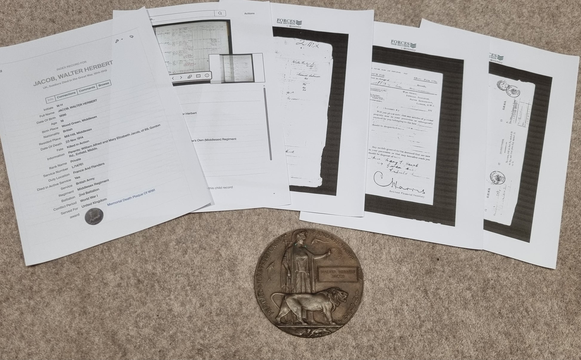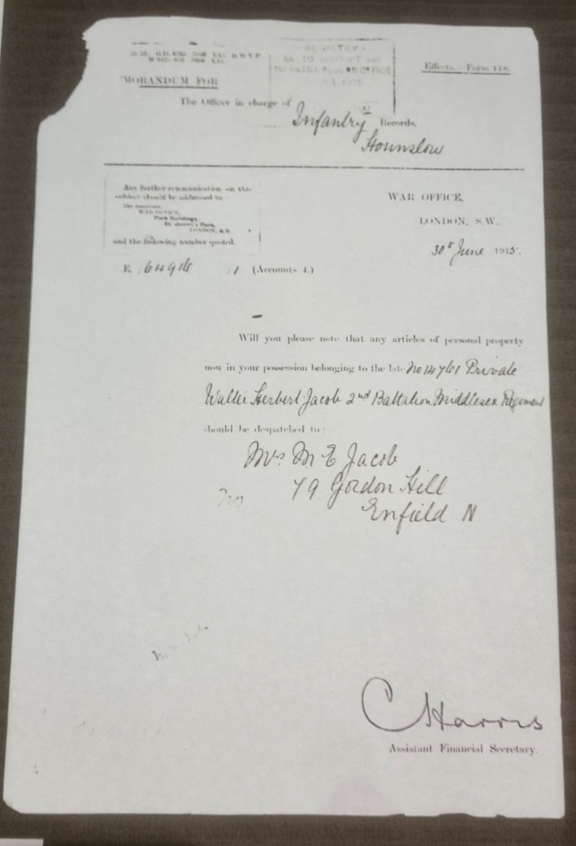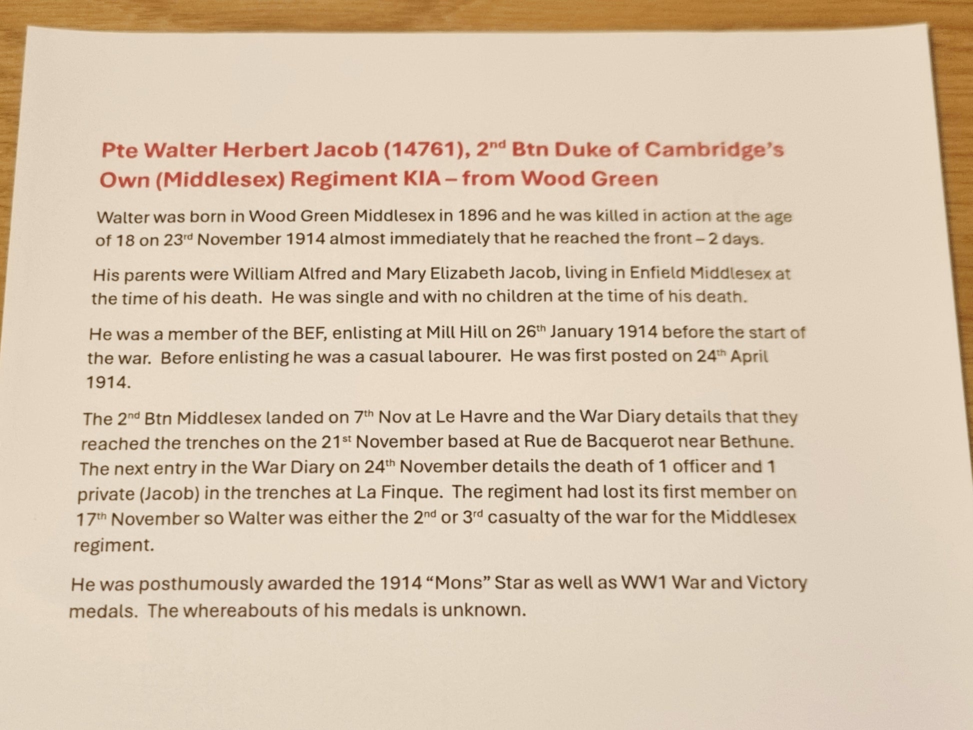 Pte Walter Herbert Jacob (14761), 2nd Btn Duke of Cambridge's Own (Middlesex) Regiment KIA - from Wood Green