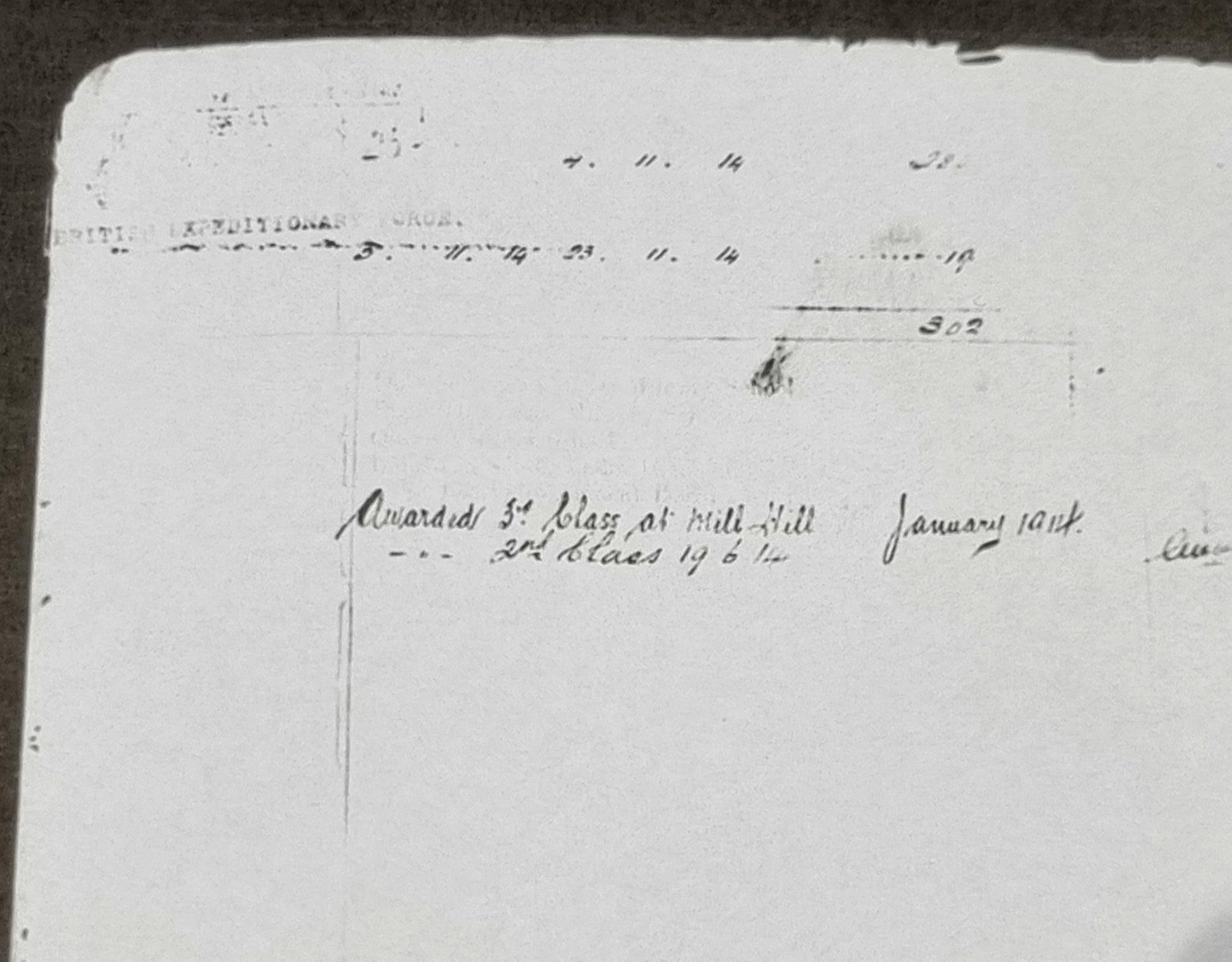 He was posthumously awarded the 1914 "Mons Star as well as WW1 War and Victory medals. The whereabouts of his medals is unknown.