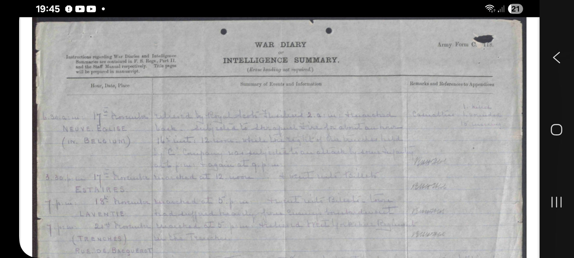 The 2nd Btn Middlesex landed on 7th Nov at Le Havre and the War Diary details that they reached the trenches on the 21st November based at Rue de Bacquerot near Bethune.