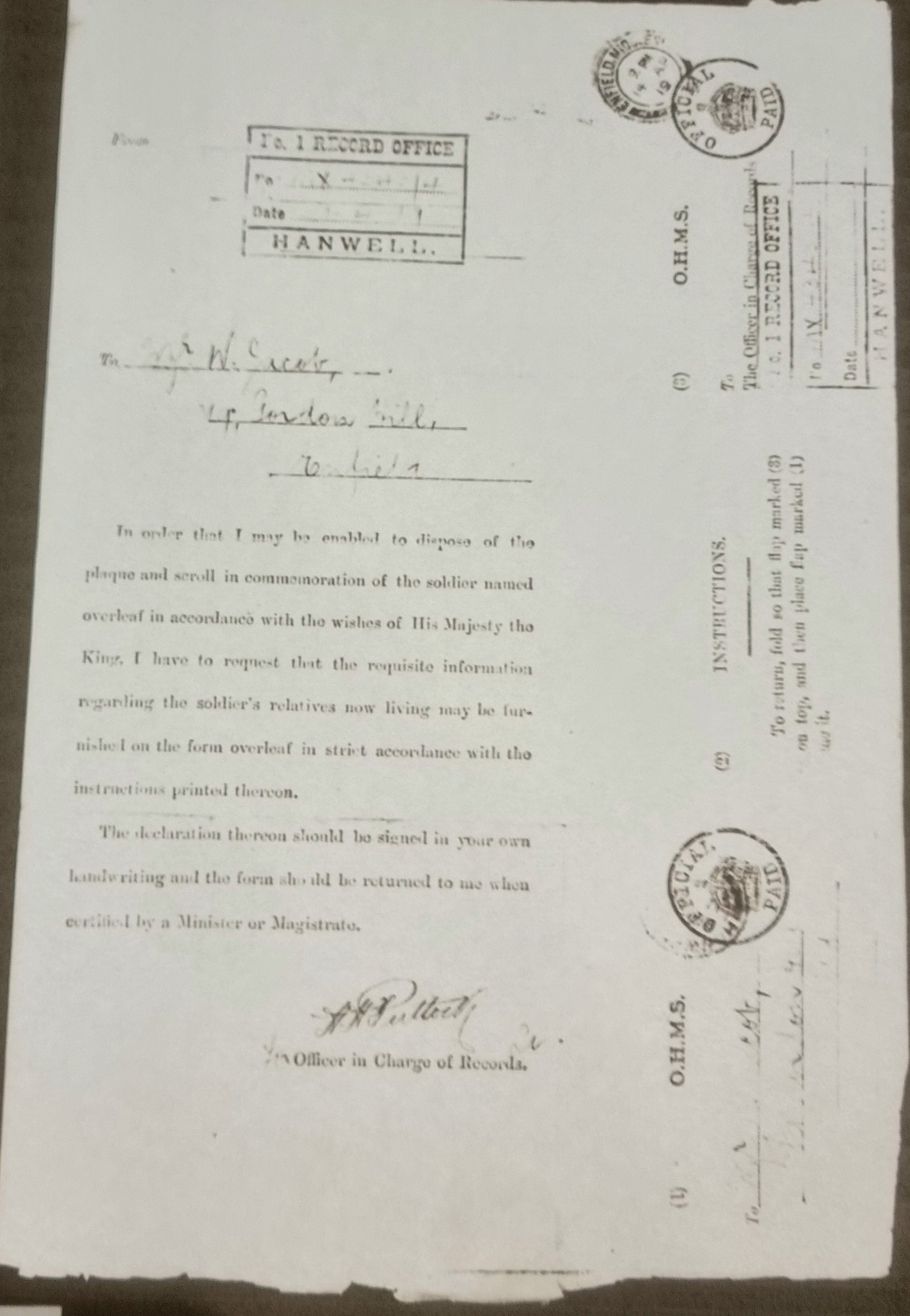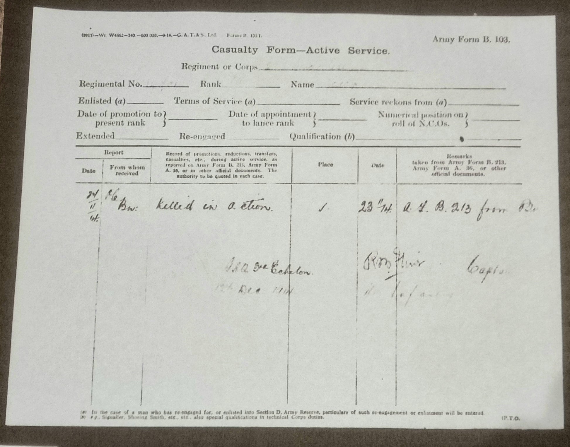 He was a member of the BEF, enlisting at Mill Hill on 26th January 1914 before the start of the war. Before enlisting he was a casual labourer. He was first posted on 24"h April 1914.