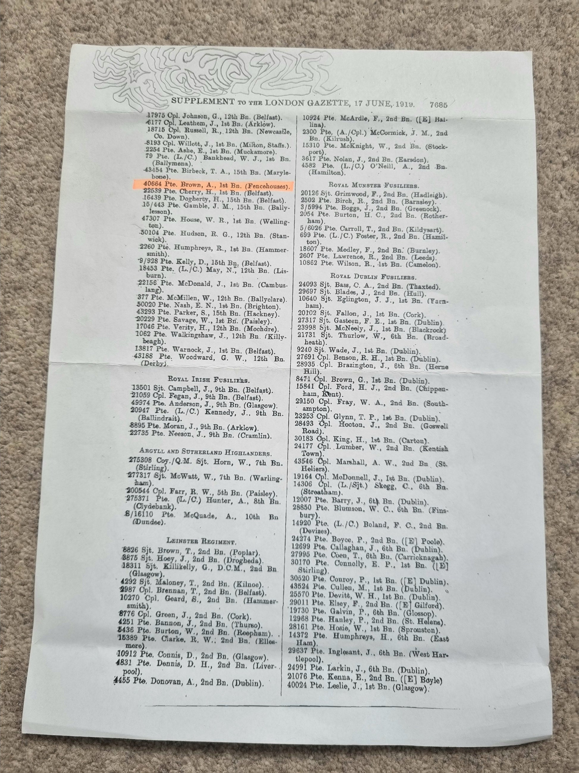 He later moved to the 1st Btn Royal Irish Rifles as a Rifleman and where he was awarded the Military Medal for gallantry, and this appears in the London Gazette dated 17th June 1919.