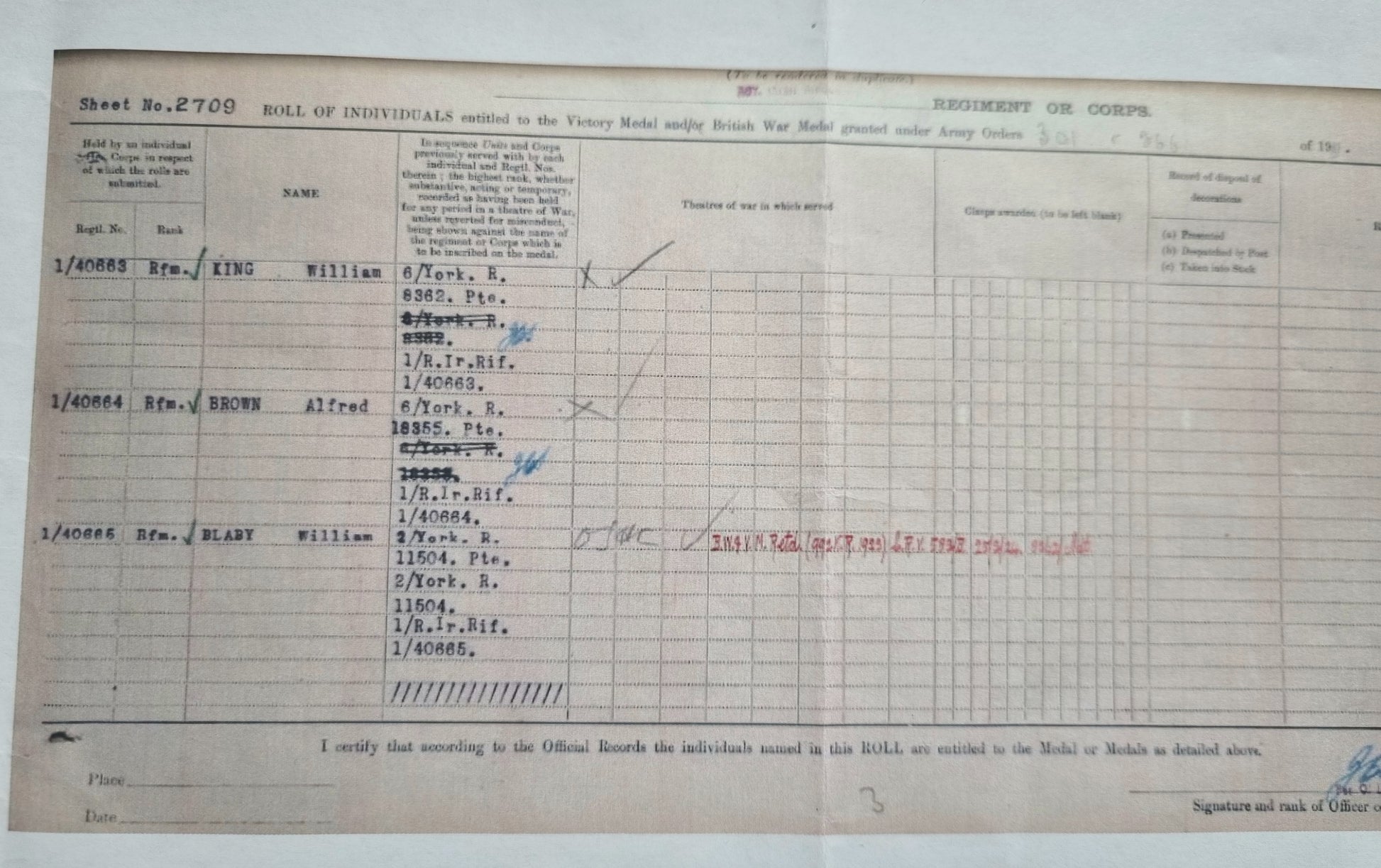 Private Alfred Brown (18355, 40664) 6th Btn Yorkshire Regt, 1st Royal Irish Rifles