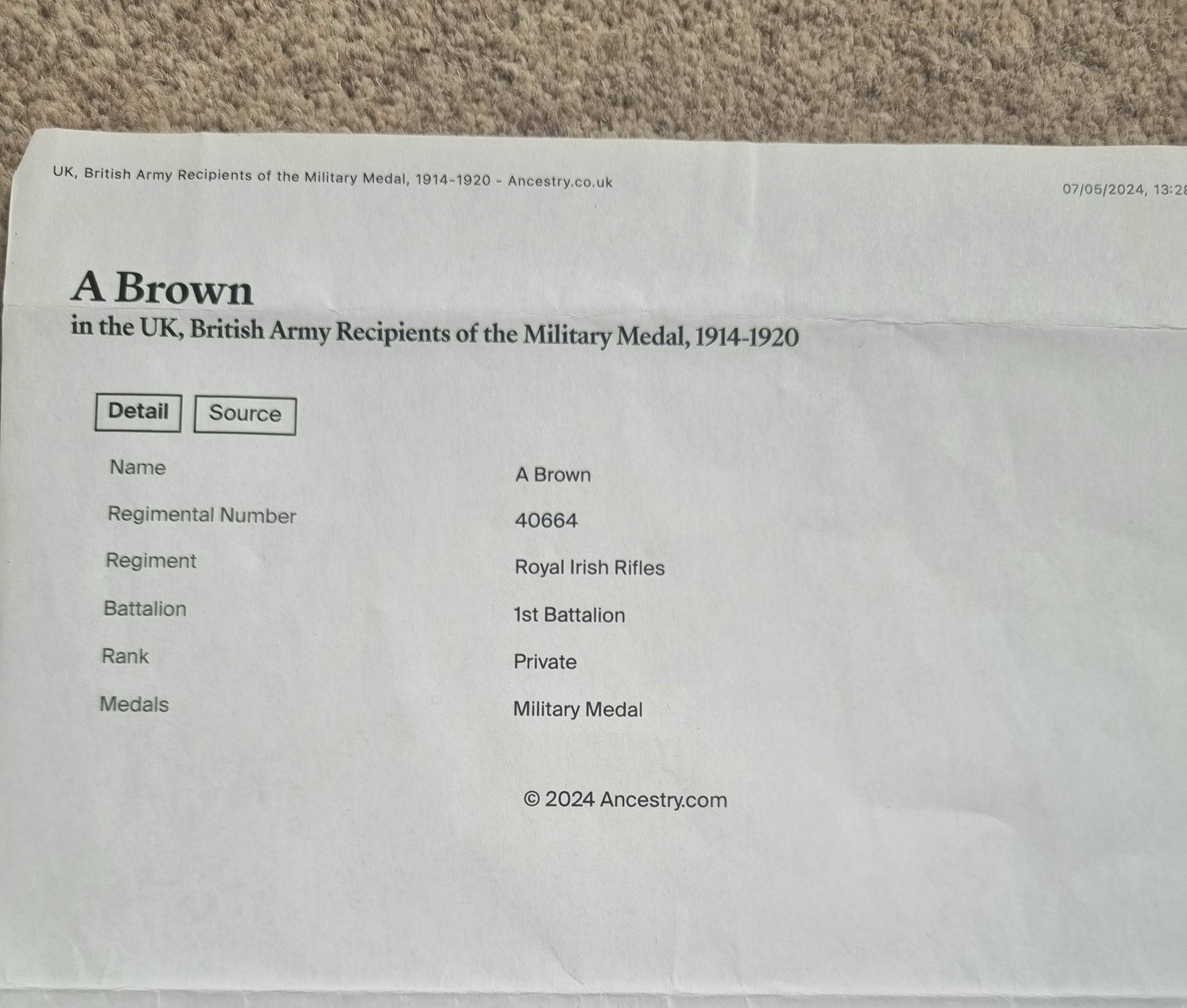 He appears within the Royal Irish Rifles regiment list roll as having received the Military Medal.