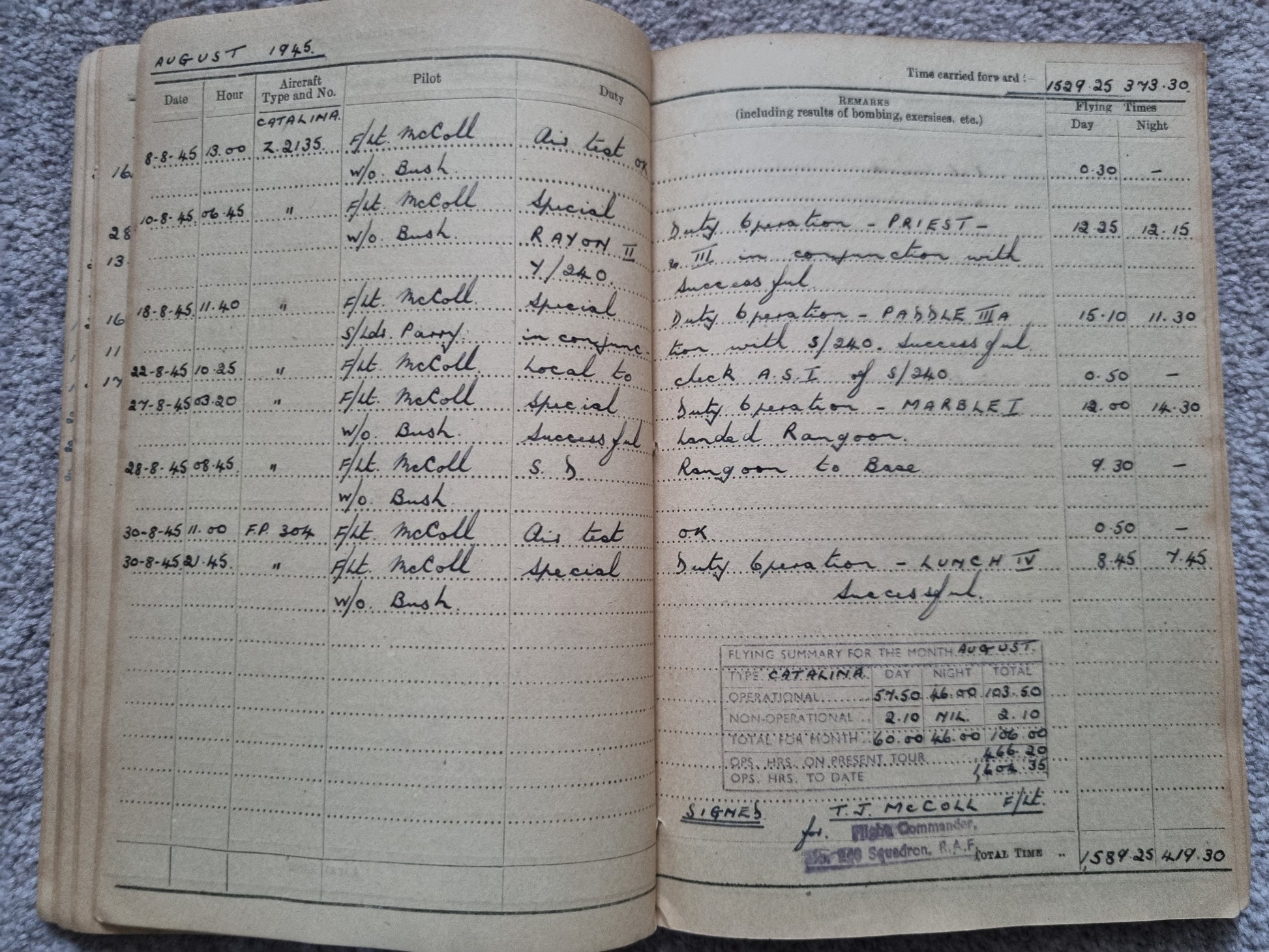 In January 1945 he was posted to 240 Squadron in Madras India flying Catalinas. Where his duties including low level bombing and more anti submarine missions. Including one instance on the 7/3/1945 recorded in his log book- “bombing DNCO (P bomb exploded in tunnel compartment)”.