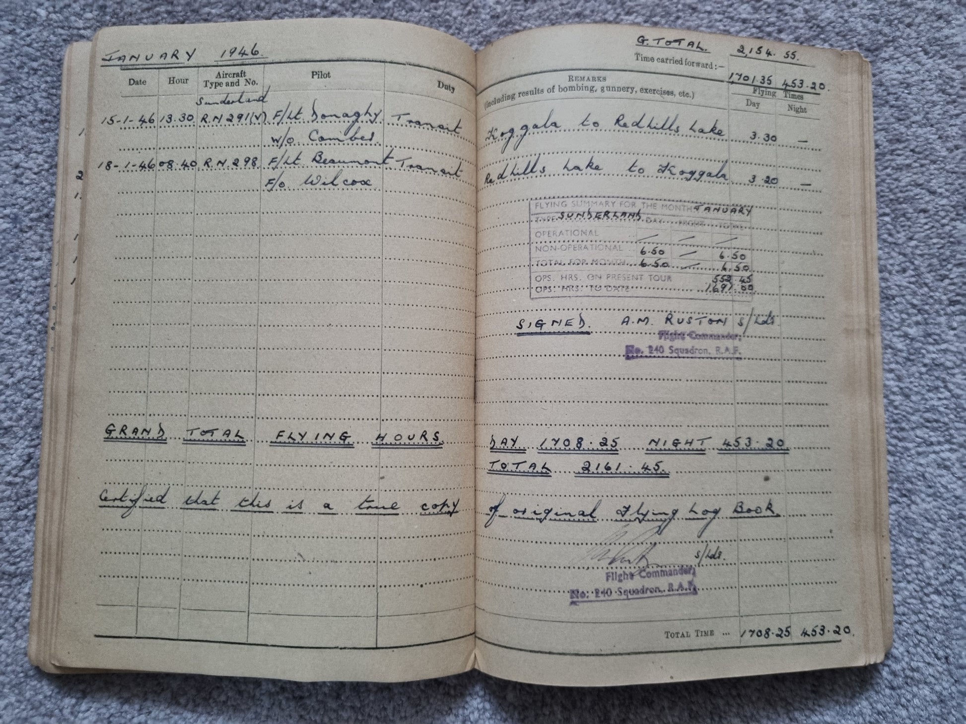 The logbook covers the period April 1941 - Jan 1946. It includes just over 1708 hours of day flying and 453 hours of night flying. Aircraft flown include Martin Mariner, Catalinas and Sunderlands. Many references to bombing missions throughout.
