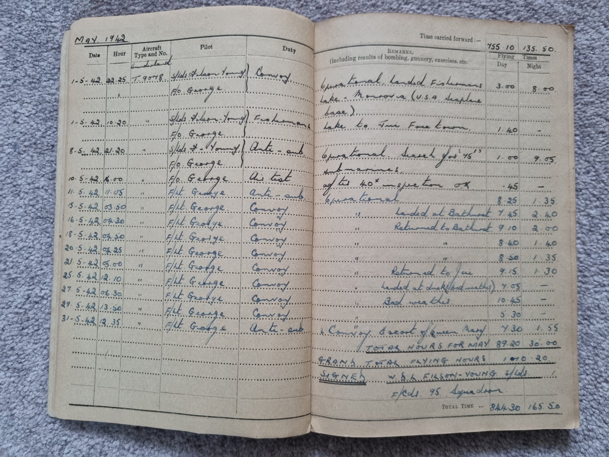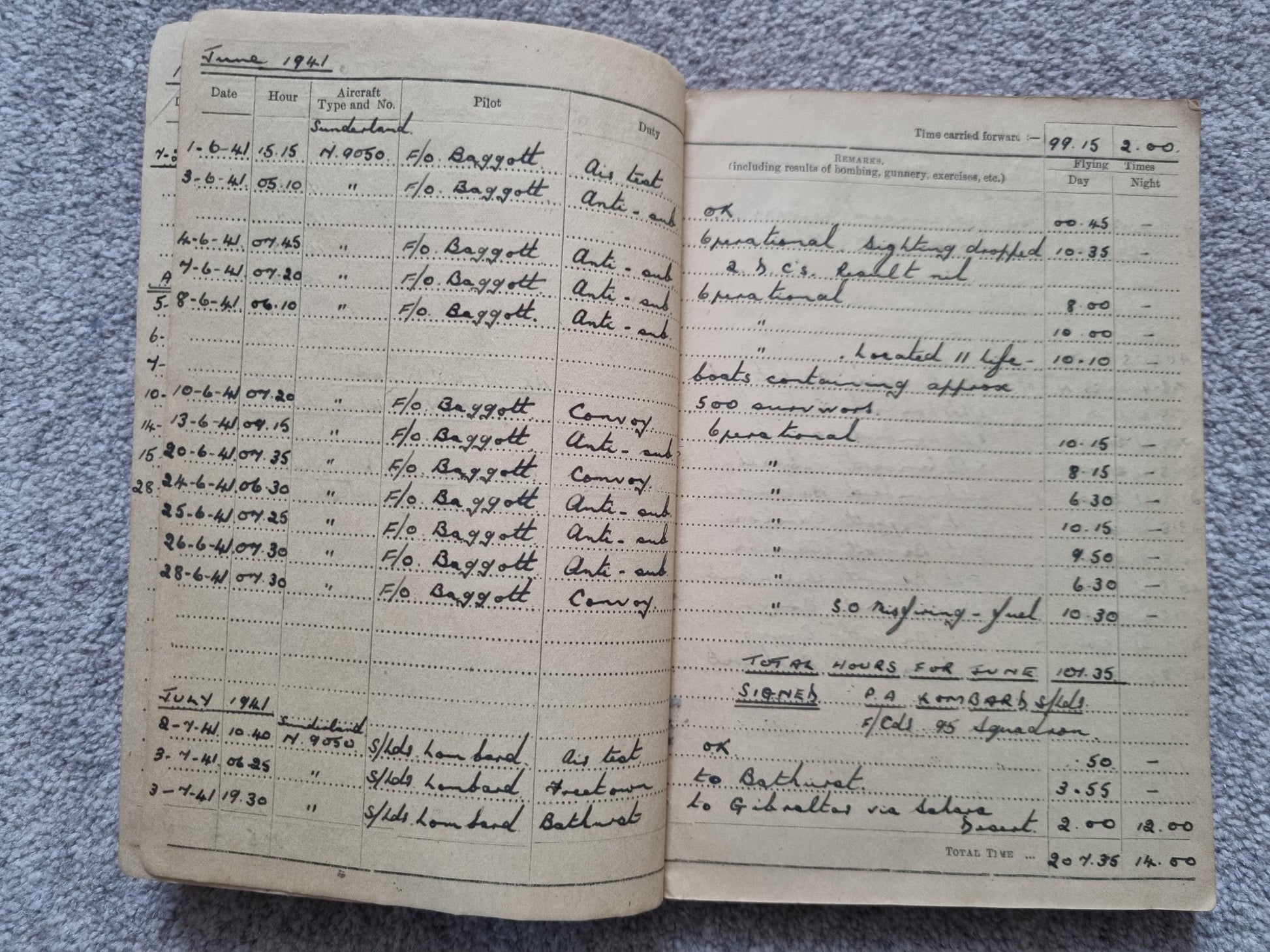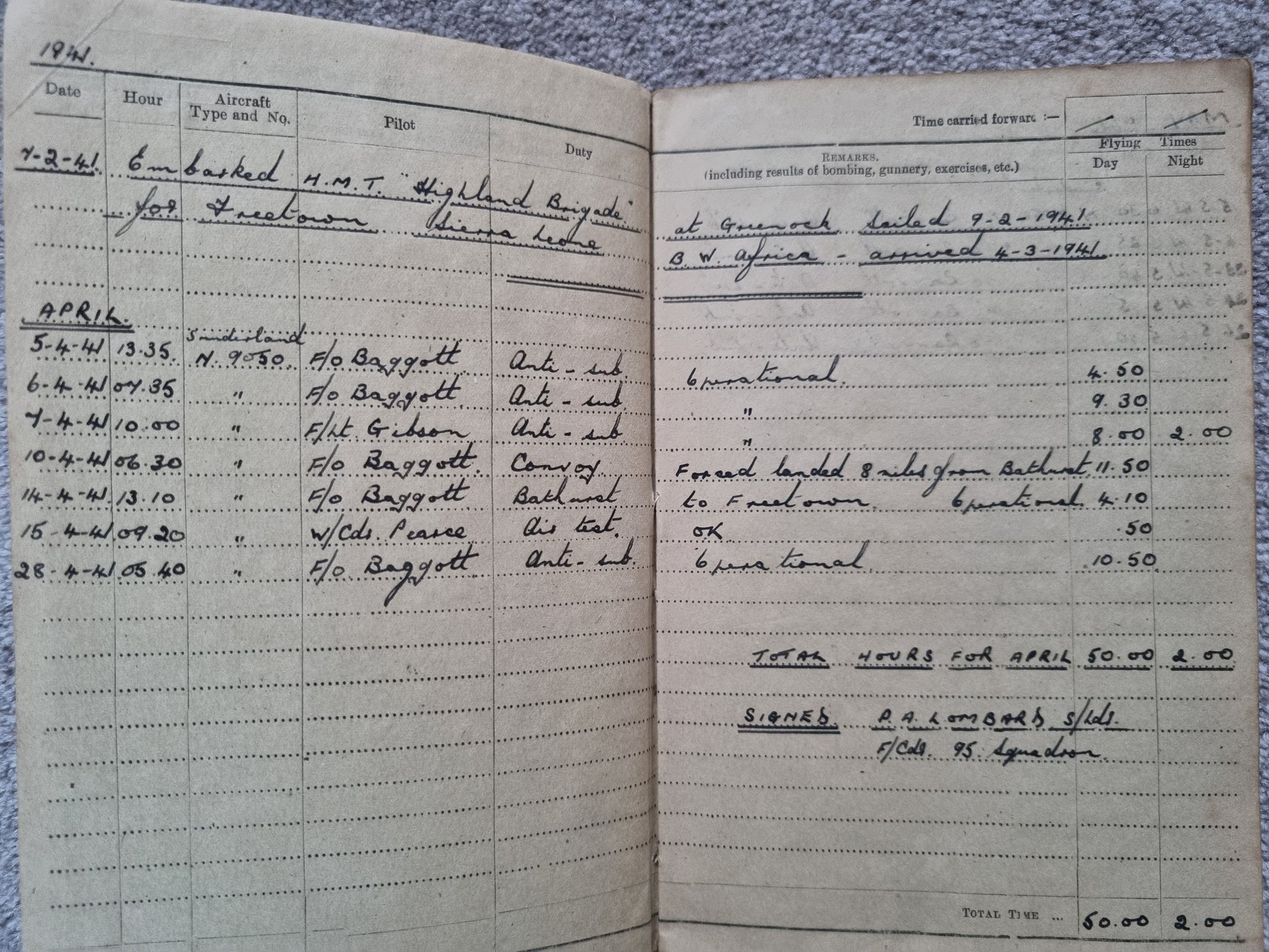 He started his wartime career by joining 95 Squadron and sailing to Sierra Leone on the HMT Highland Brigade in early 1941. Based in Africa He flew many anti-submarine missions as well as convoy escorts and camera missions, mostly in Sunderlands. On one such mission on the 03/6/41 he spotted a German U-Boat, his log reading “Operational sighting, dropped 2 DCs (depth charges), result nil.”