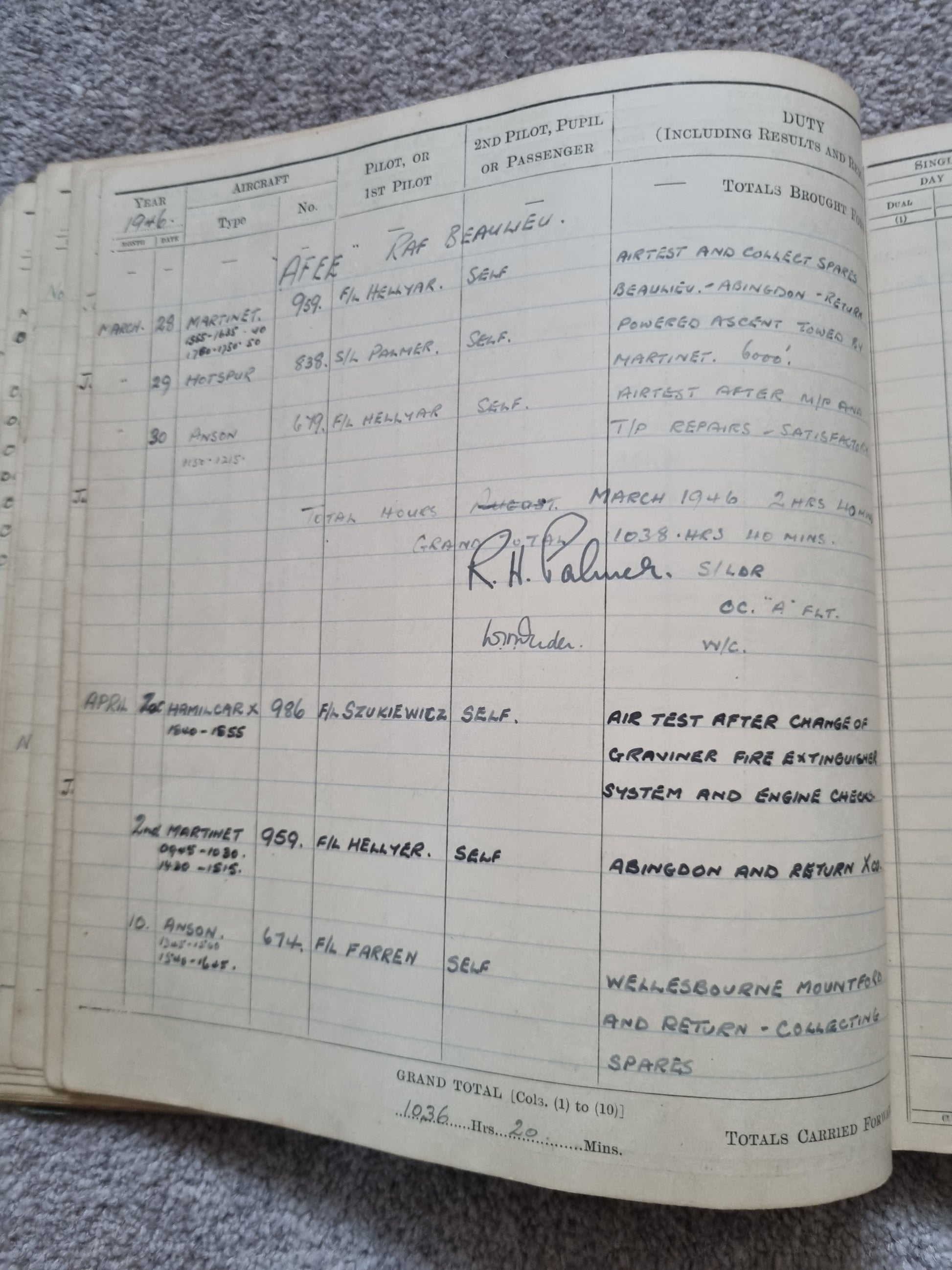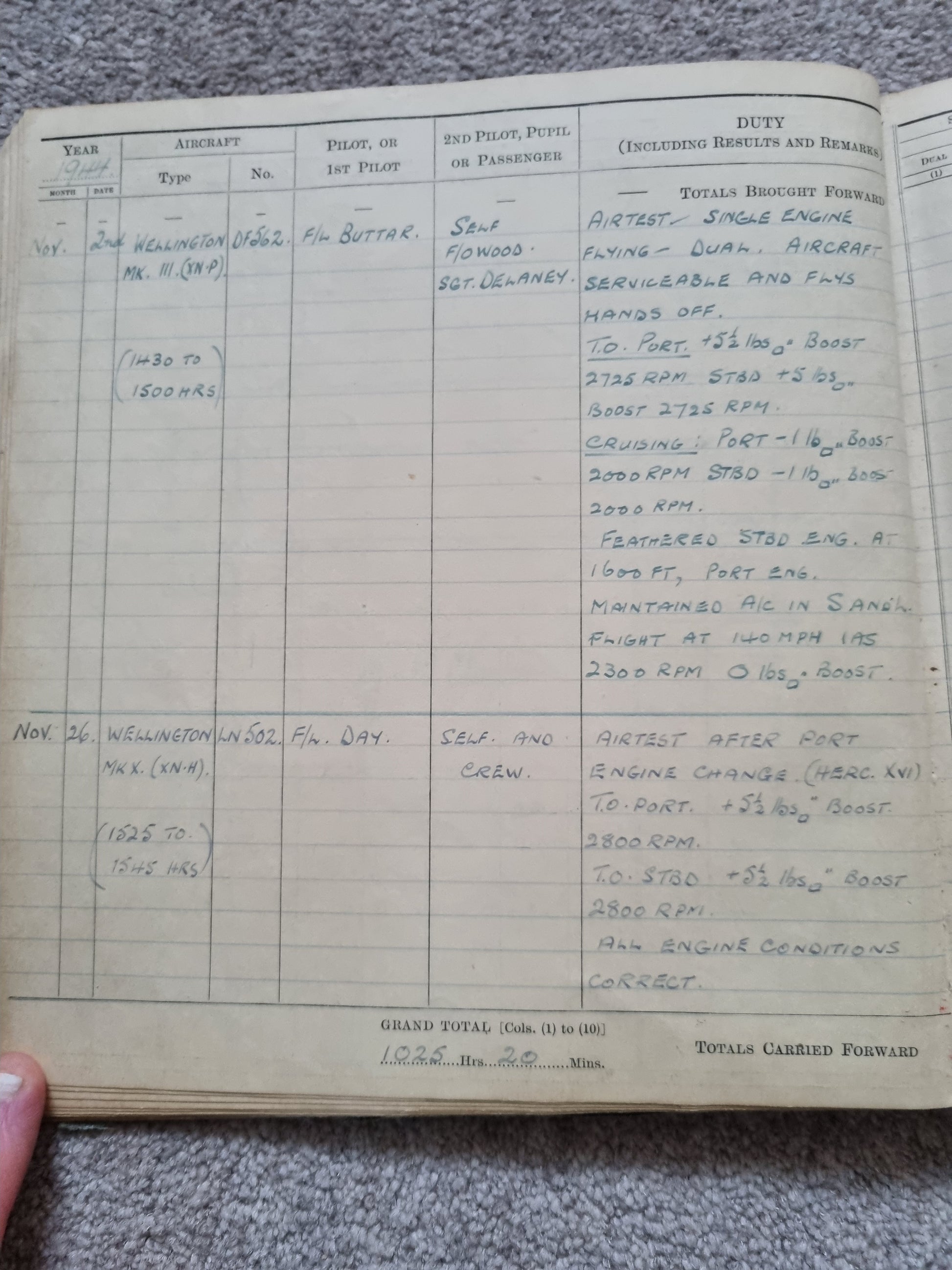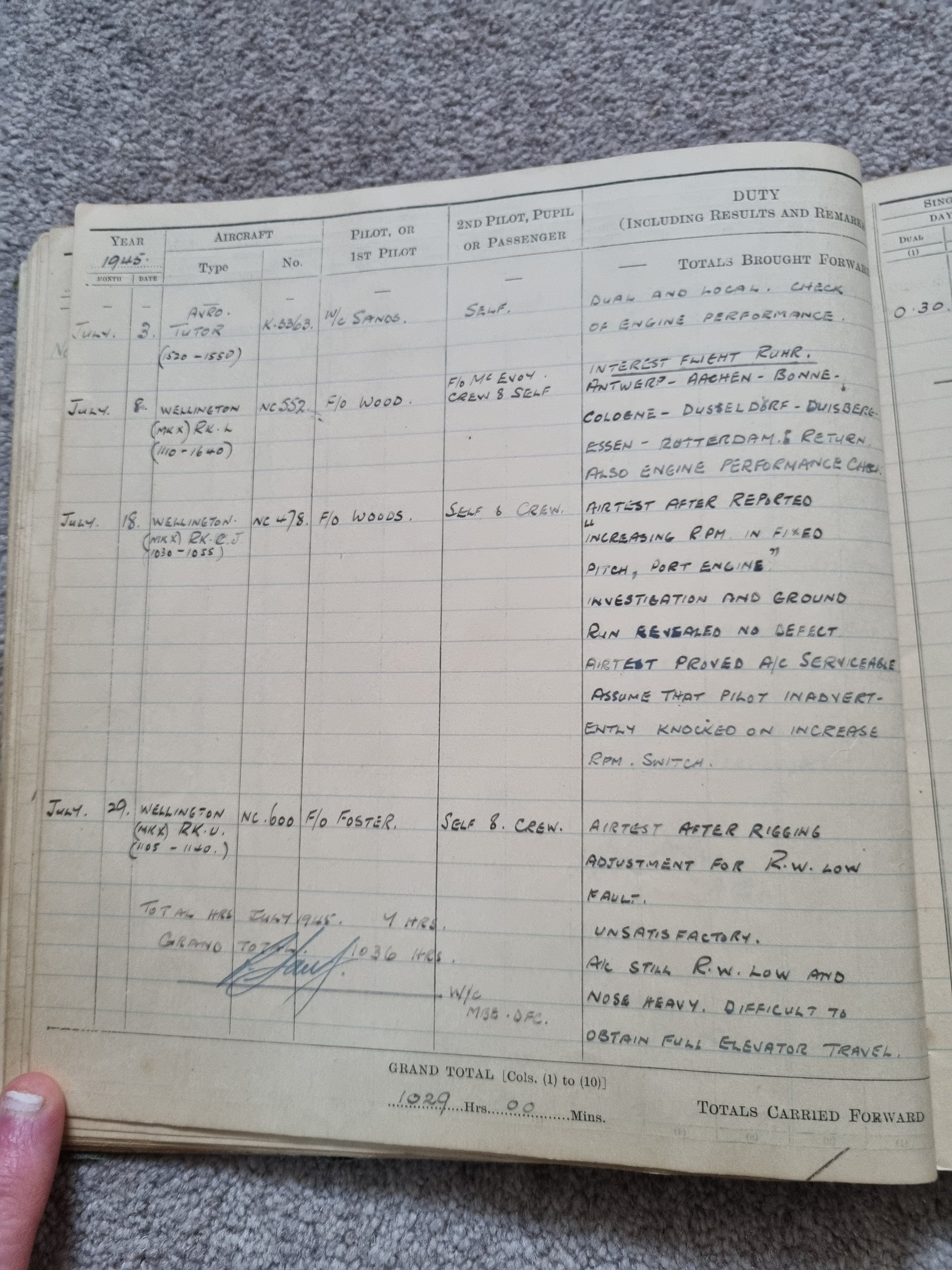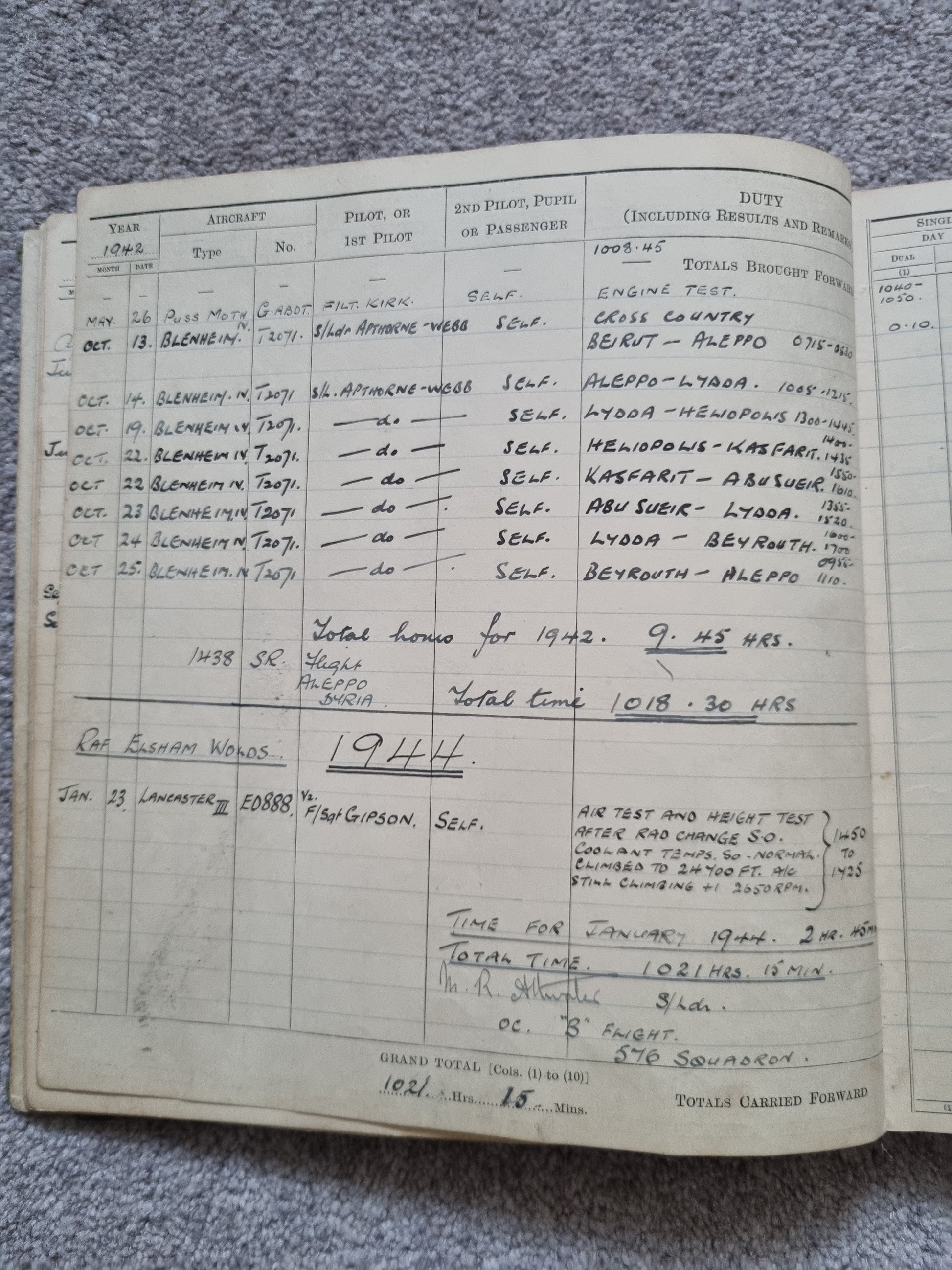The logbook then jumps to 1944 at RAF Elsham Wolds flying Lancasters in 576 Squadron, carrying out air tests and training for the remainder of the rest of the war.