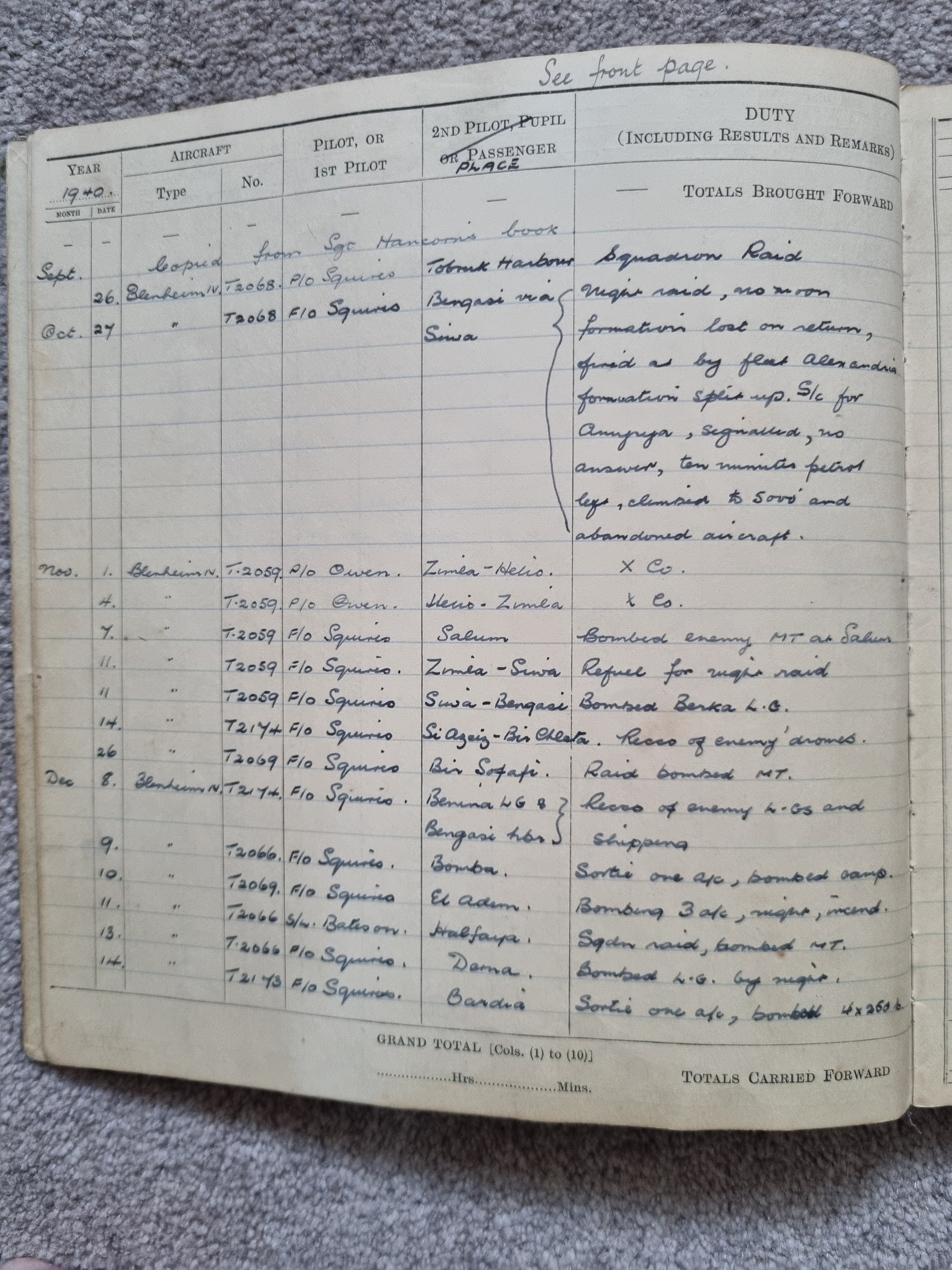 The front of this log book describes the destroyed log book and a mission in 1940 where he was forced to bail out on a raid over Bengazi due to lack of fuel and descended 5000 feet by Parachute.