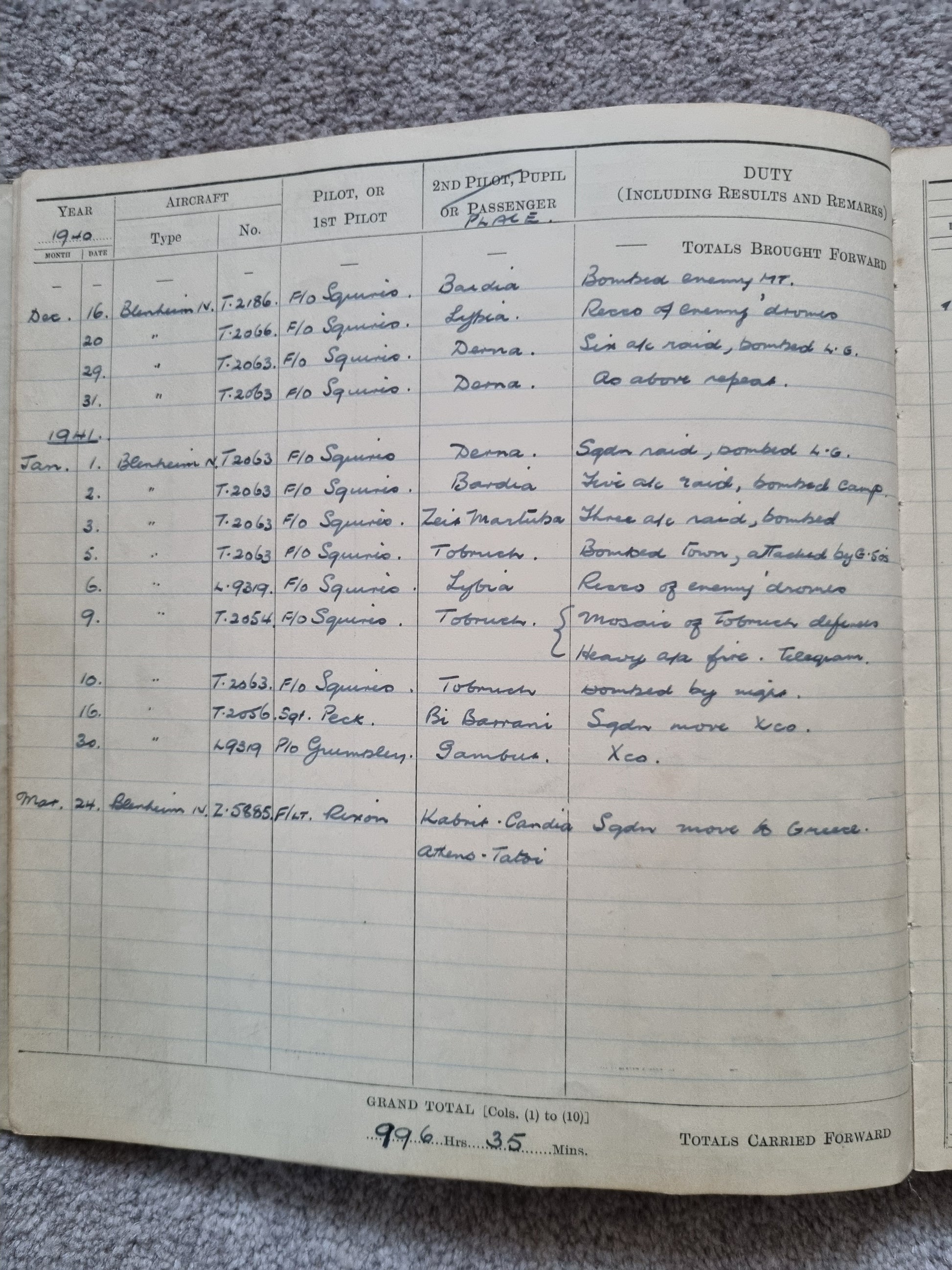 During 1940 he flew many Operational missions over North Africa before moving to Greece in 1941. There are details of many bombing raids and being attacked / fired upon.