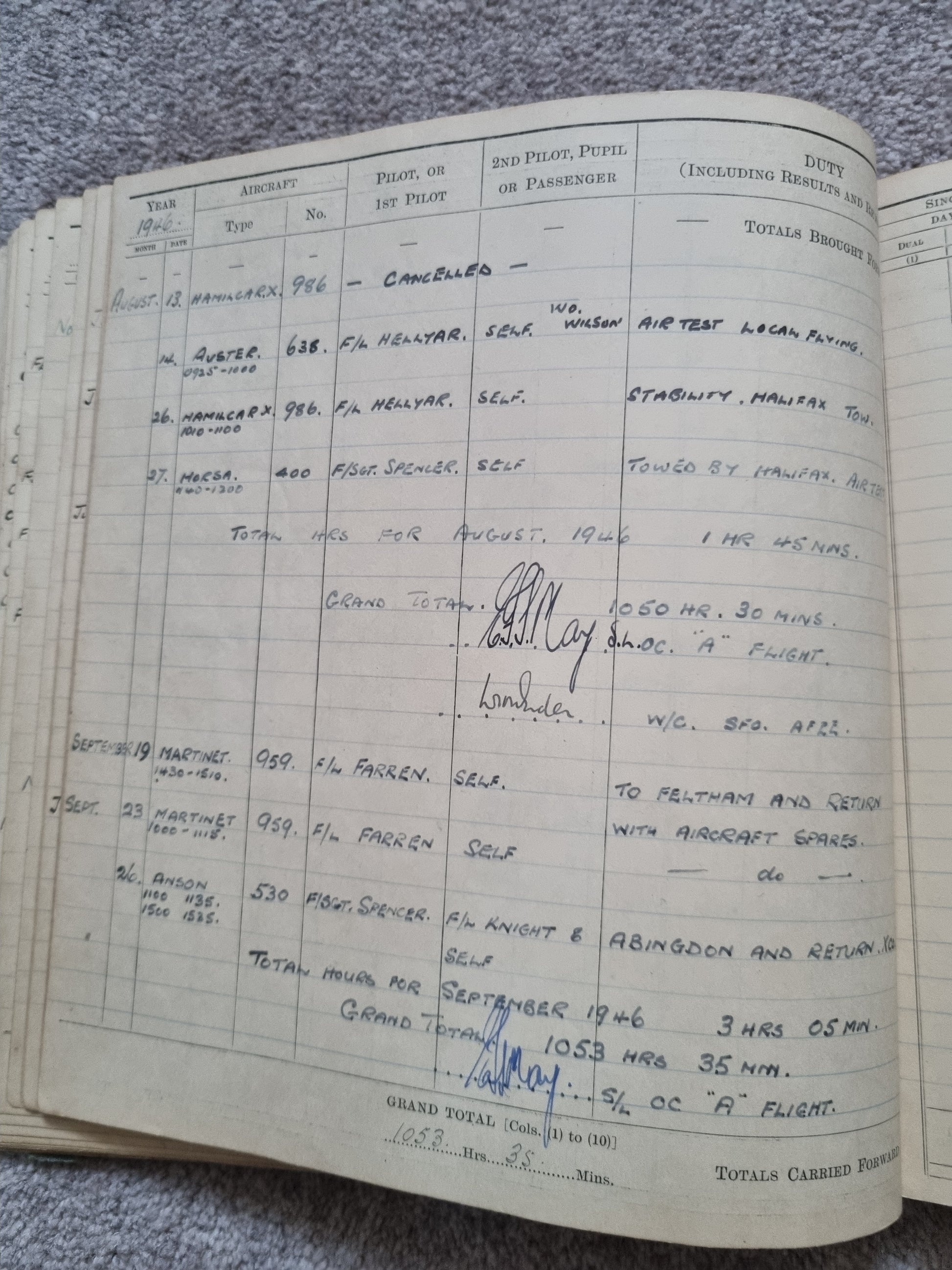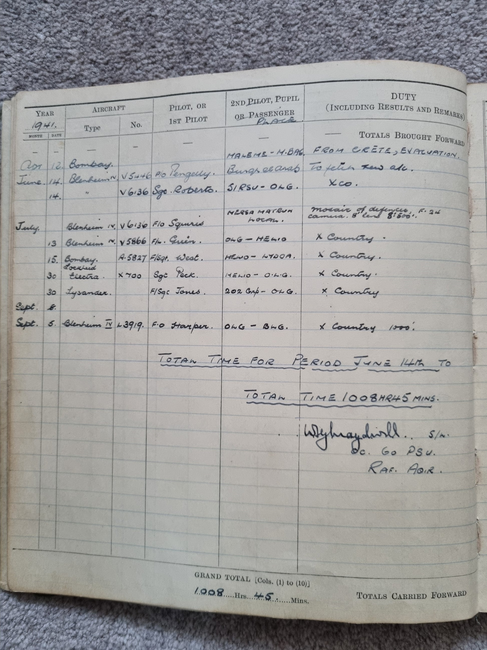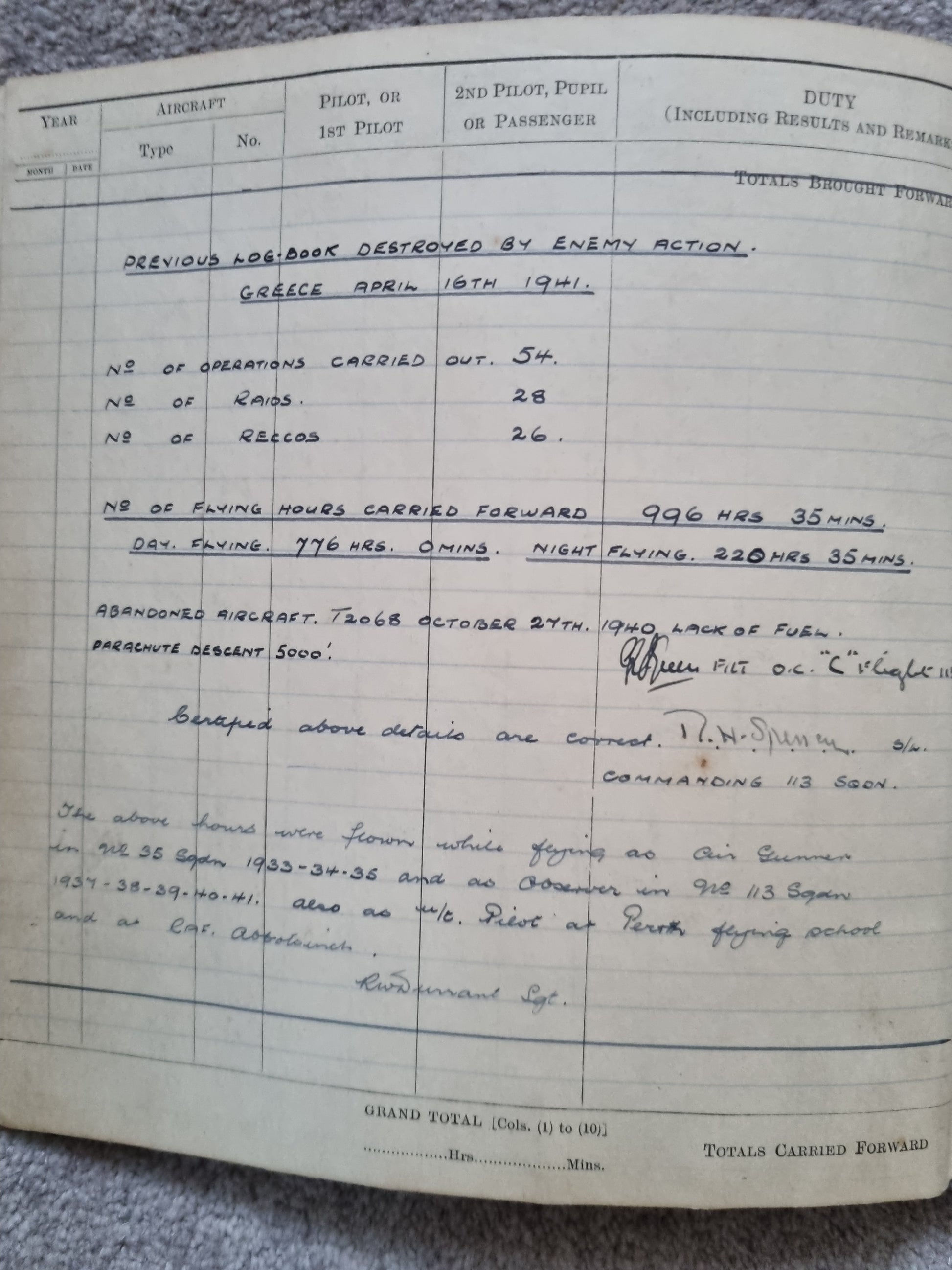 He completed just over 1058 hours of flying, 996 hours of which are carried over from a previous log book that was destroyed in enemy action over Greece in 1941. The remnants of this log book, (10 pages) are also included in the set, the pages remaining are from his early flying days in 1936.