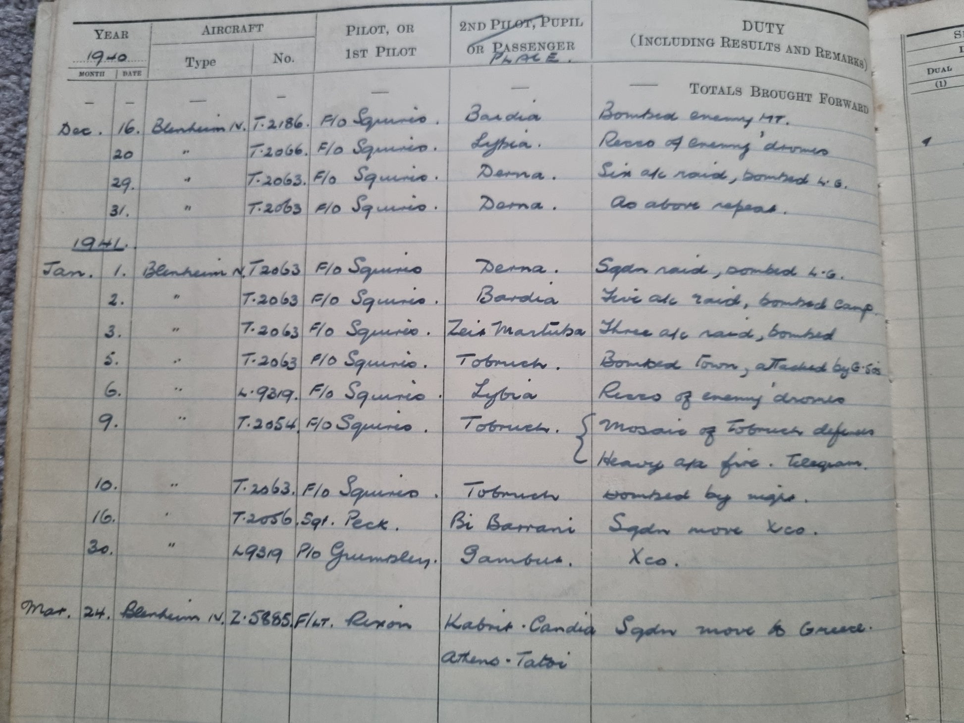 | 05/01/41 | Blenheim IV T2063 | F/O Squire | Tobruk | Bombed town, attacked by G50s |
