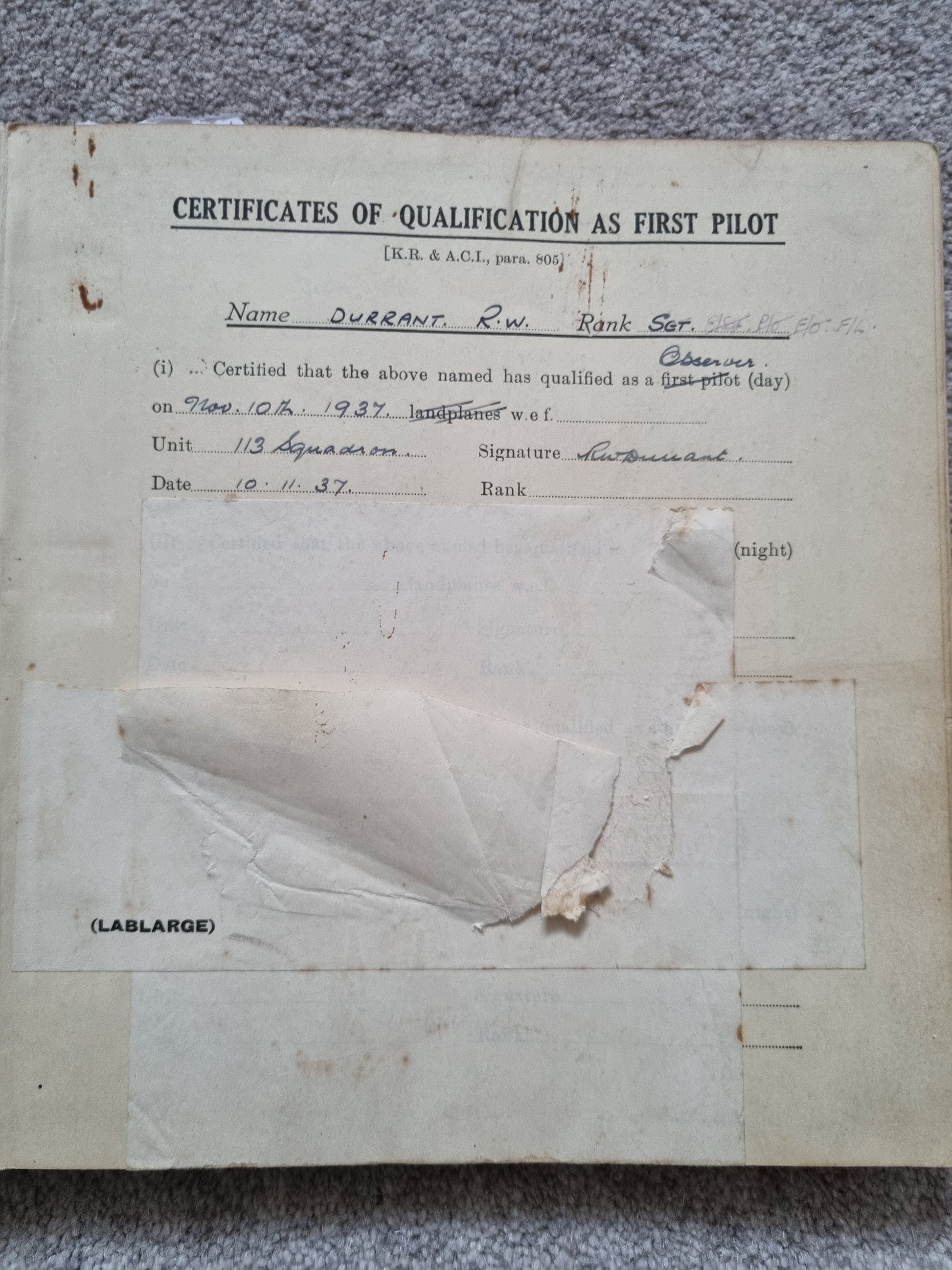 It is unknown when Durrant joined the RAF, but he attended Perth Flying school and RAF Abbotsinch. He was posted to 35 Squadron as an air gunner in 1933, serving with them until 1935 before joining 113 Squadron as an Observer from 1937-1941.
