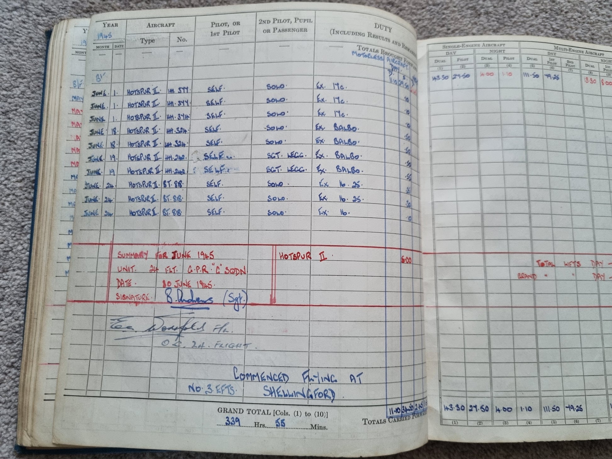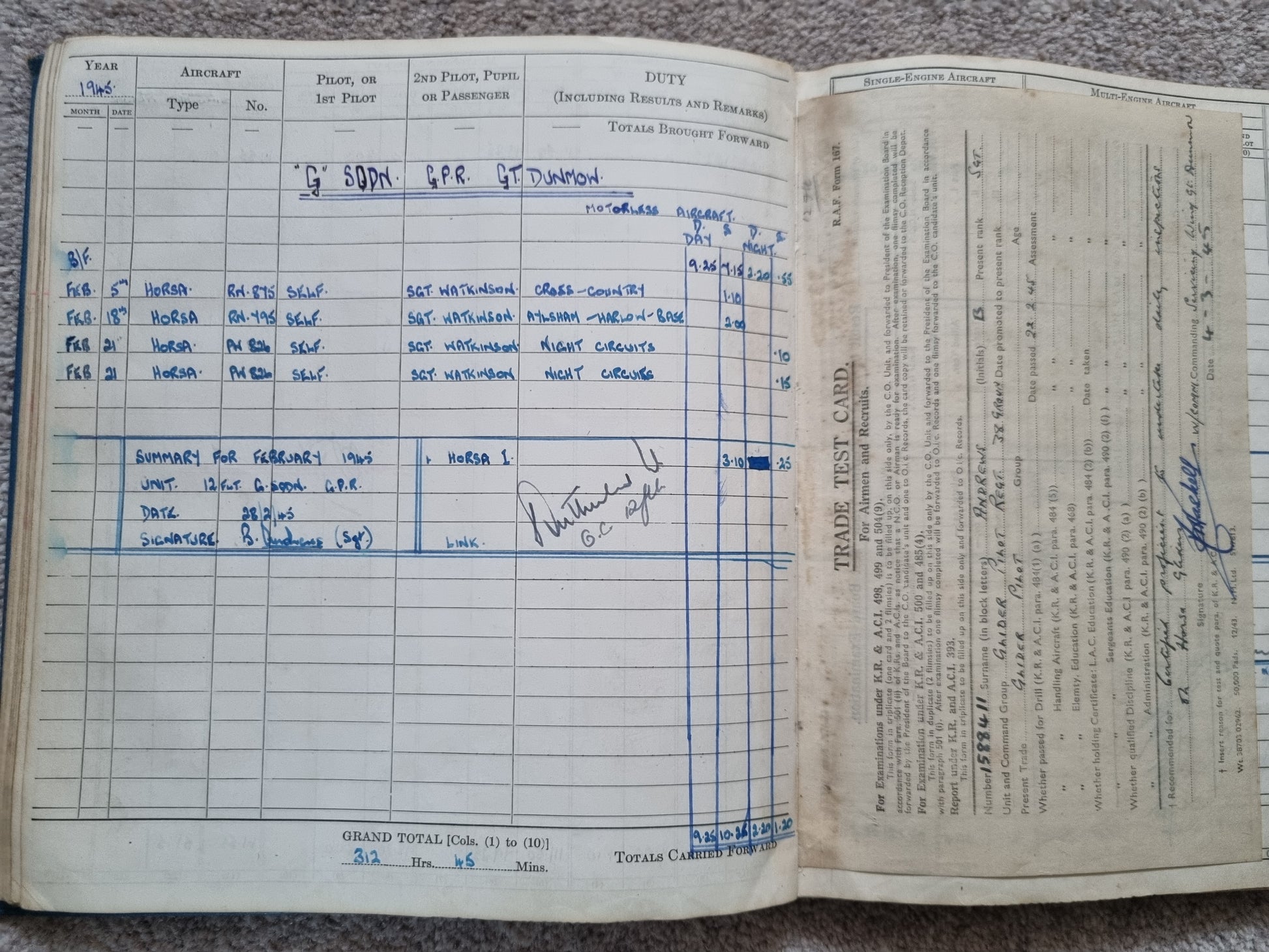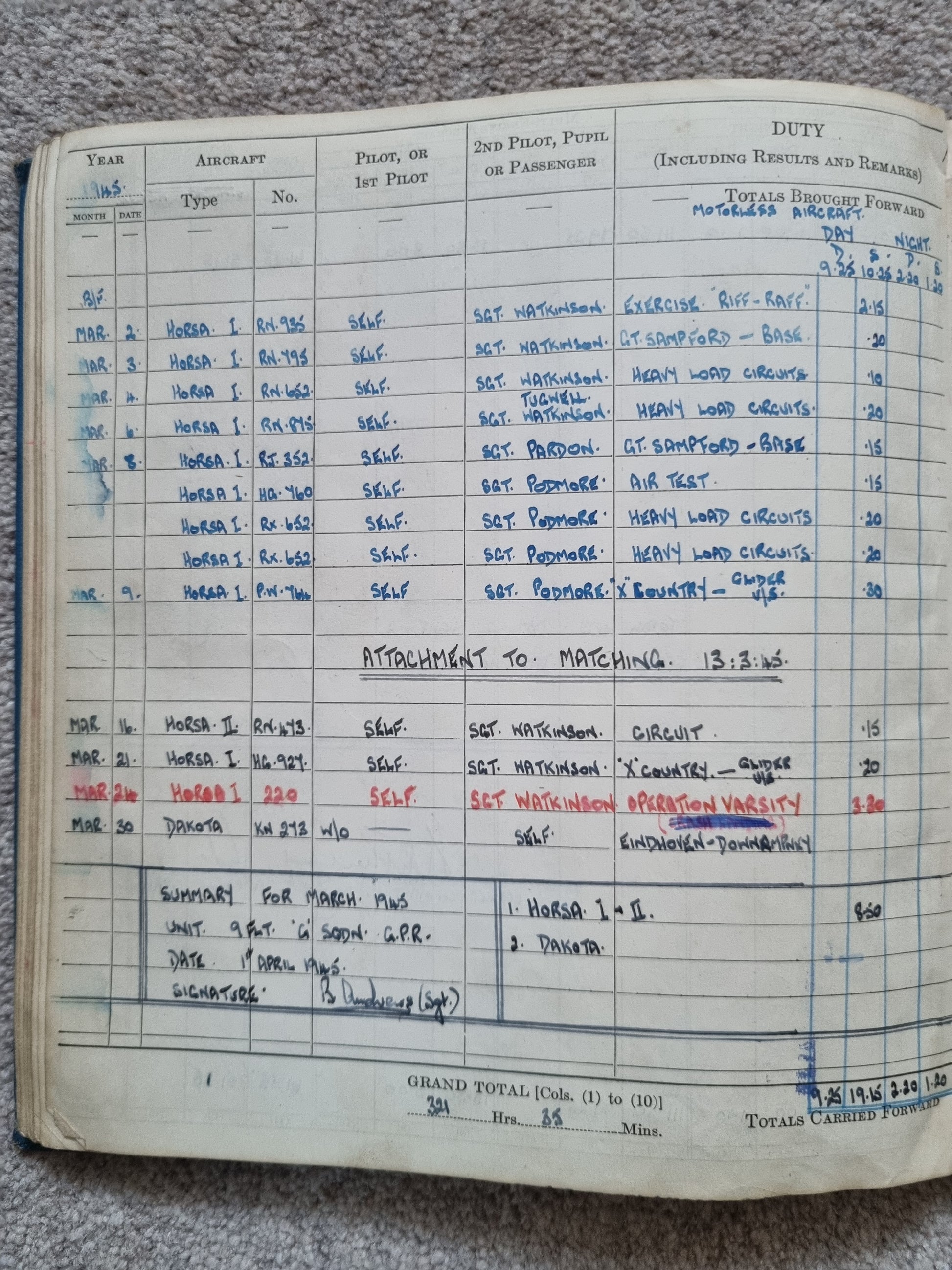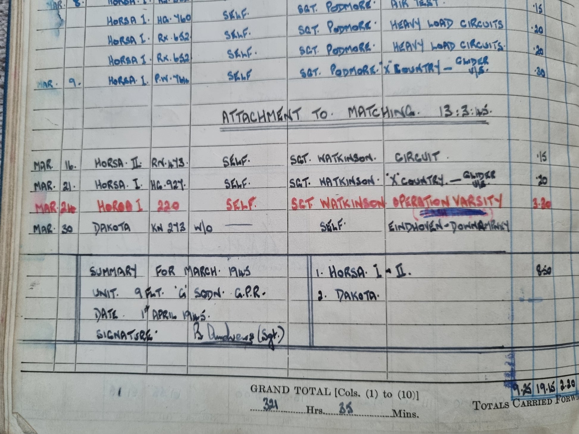 It includes a huge number of flying hours over the 4 years, including flying gliders from Nov 1944 - June 1945. His totals were 564 hours, 50 mins.