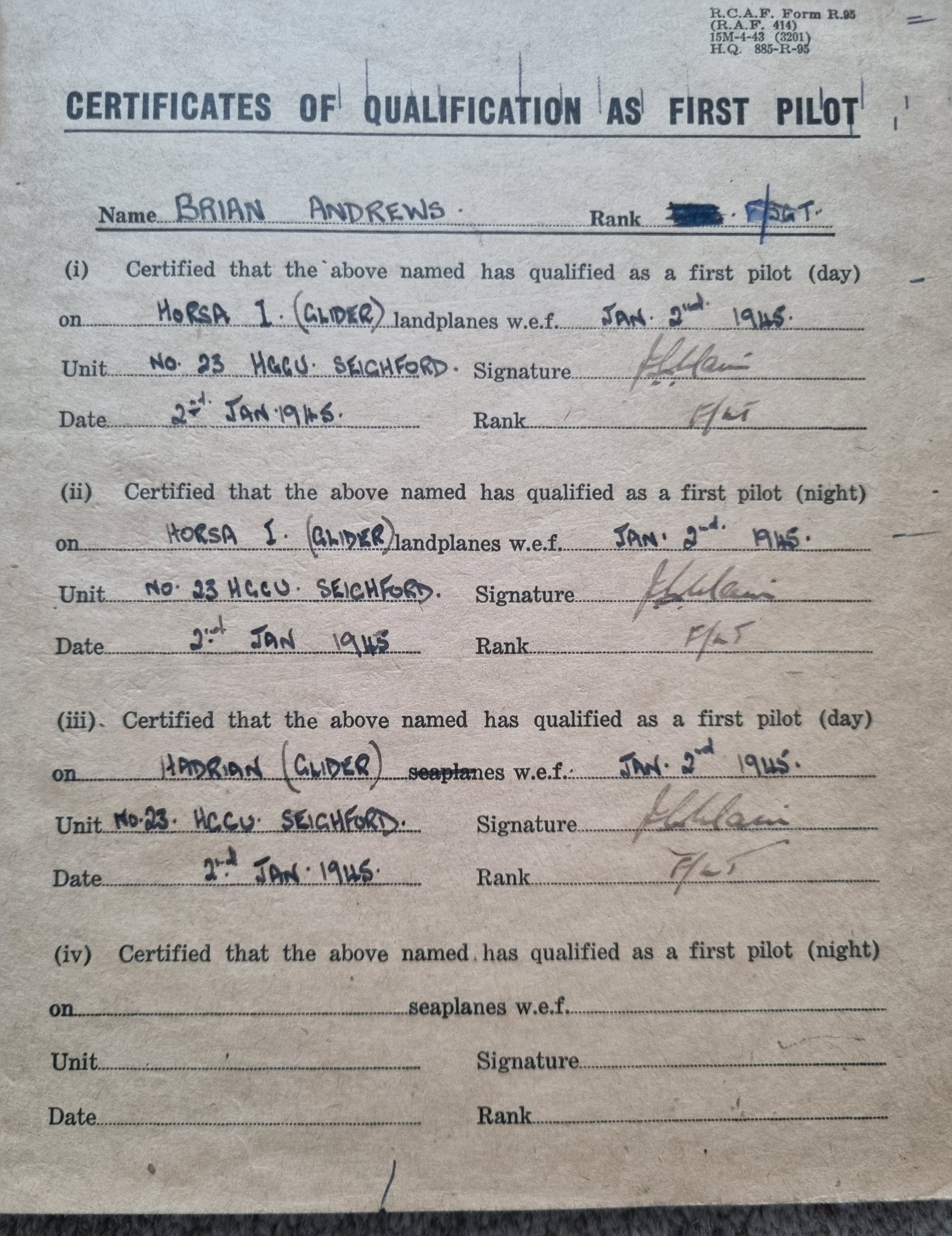 He moved from Canada to No.1 GLIDER Training School (GTS) Croughton in England in November 1944, mostly flying Hotspur II’s. He then moved to Heavy GLIDER Conversion Unit (HGCU) Seighford in Dec 1944, flying Horsa’s and Hadrian’s.
