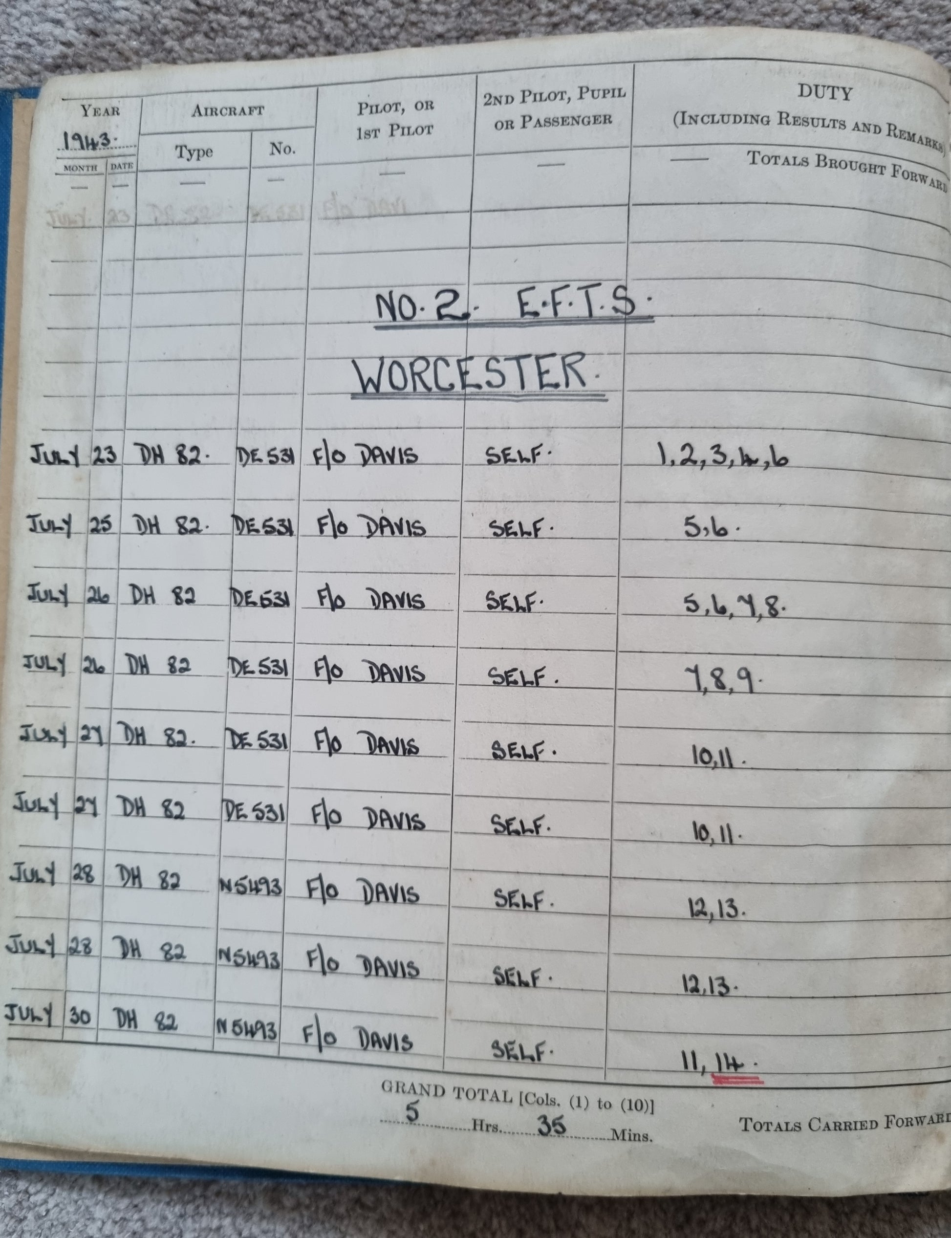 HE began his training in July 1943 in No.2 EFTS (Elementary Flying Training School) Worcester, Canada, moving to No. 35 EFTS Neepawa, Manitoba, Canada 18thOctober 1943 and No.33 SFTS (Special Flying Training School), Carberry, Canada in February 1944.