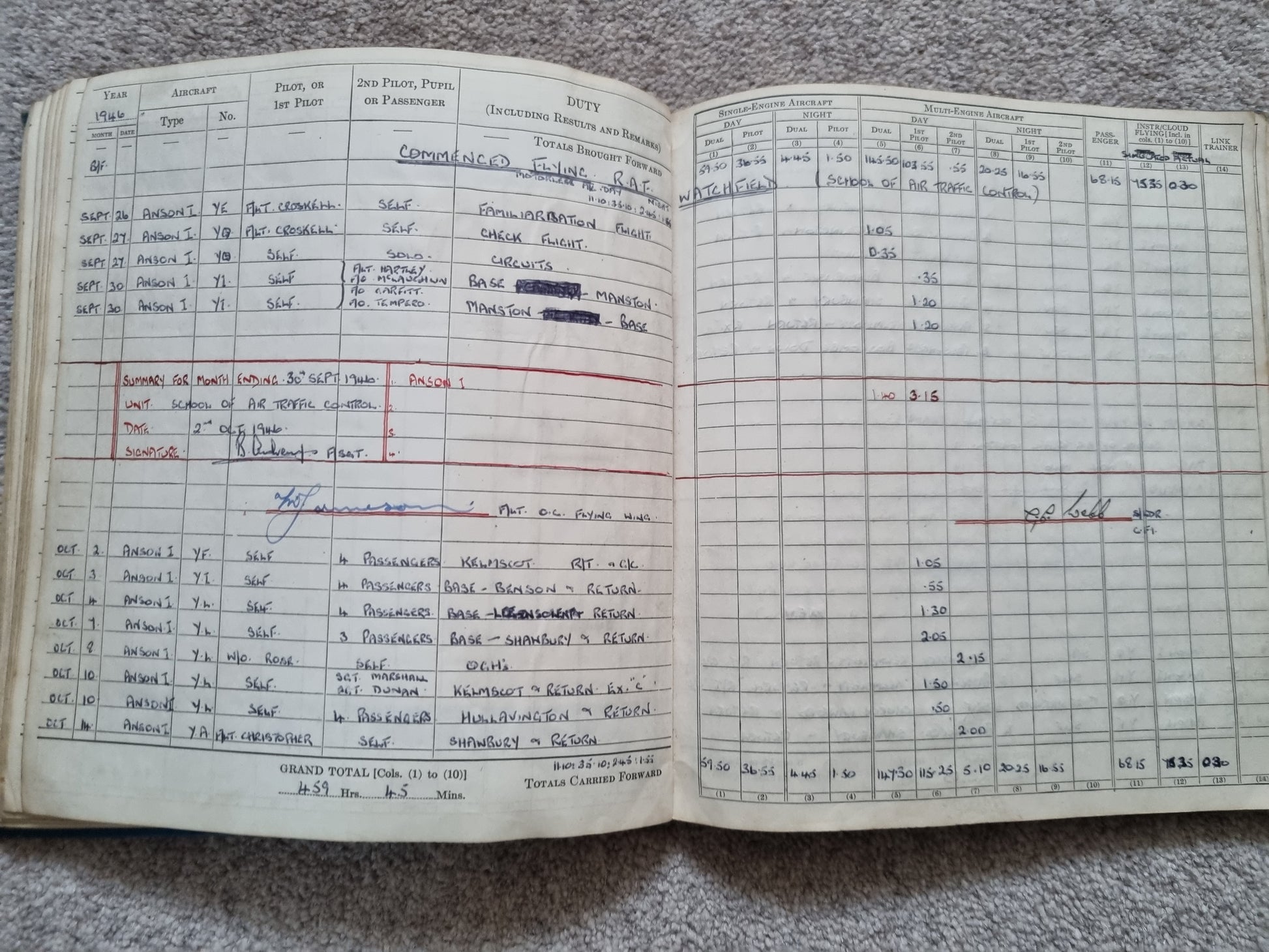 G Squadron then moved to Shorden on the 20th May 1945, before spending the end of the war in RAF Shellingford. He continued flying until 1947 and there are some entries marked for live bombing in Sept 1946 whilst flying Oxford’s.