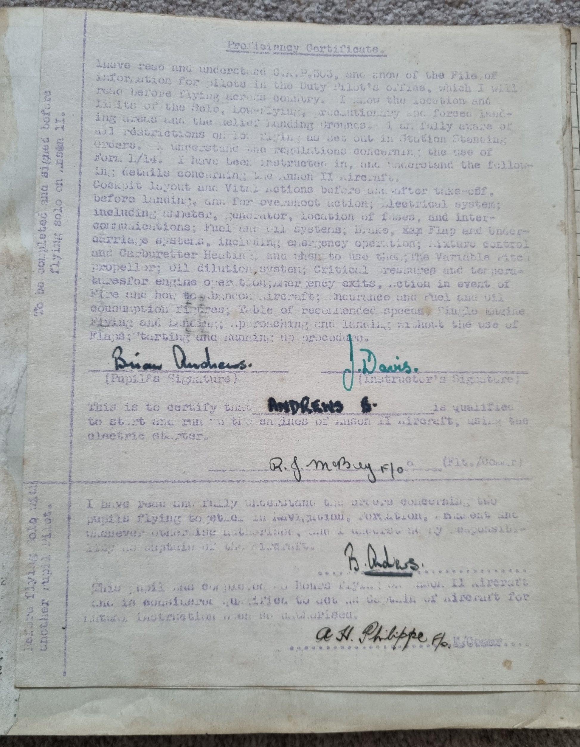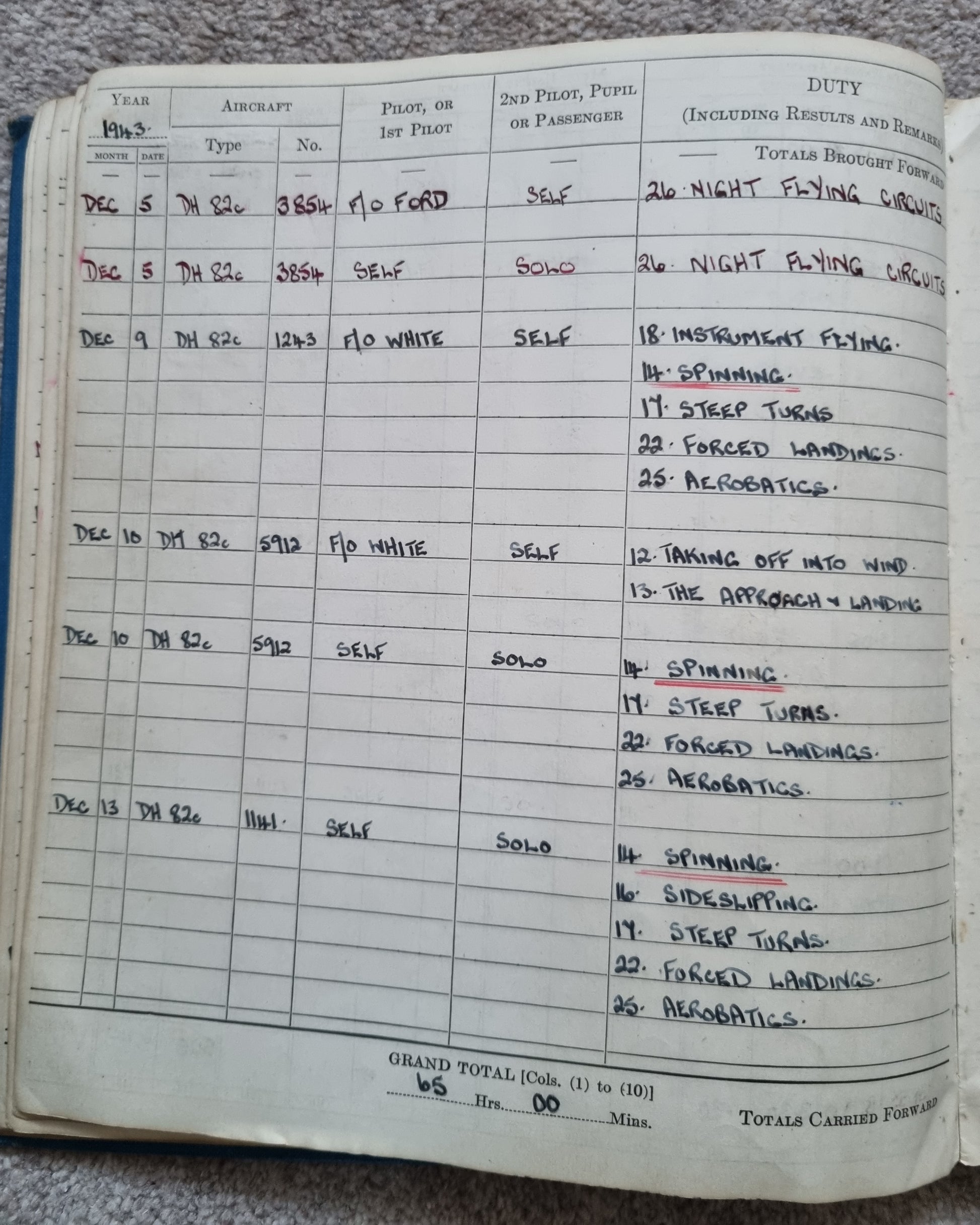 Aircraft flown include DH82, Anson, Horspur glider, Horsa gliders, Oxfords, Dakota