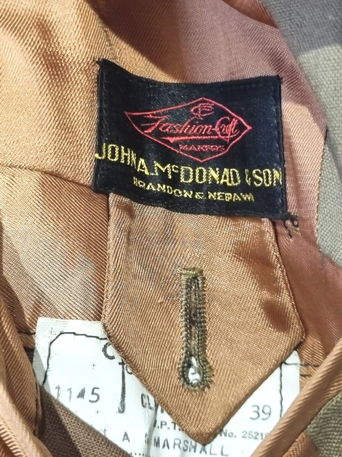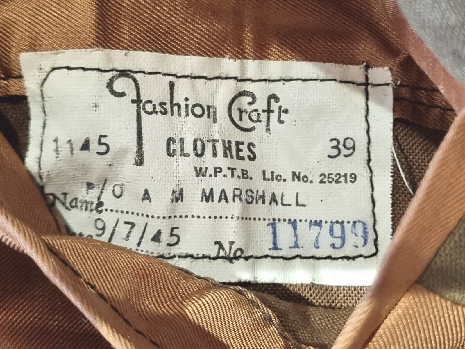 The uniform is named to Pilot Officer A M Marshall and dated July 1945. It was tailored by John A McDonald & Son.