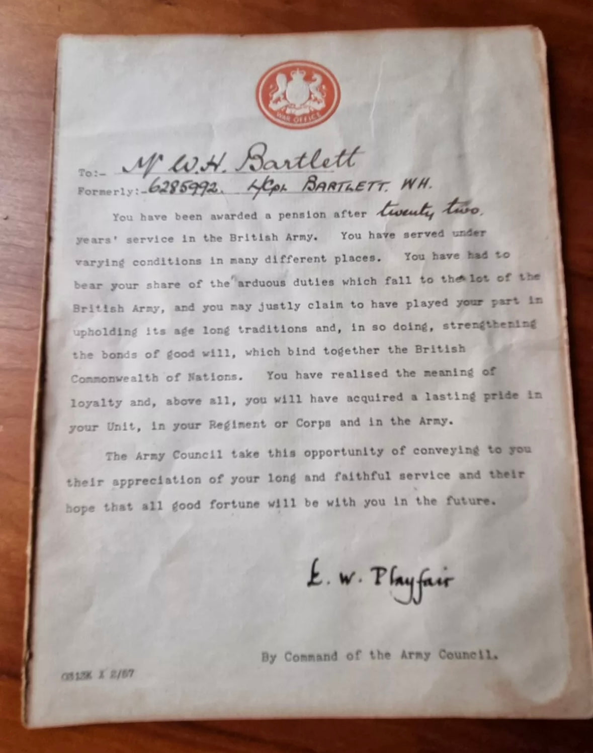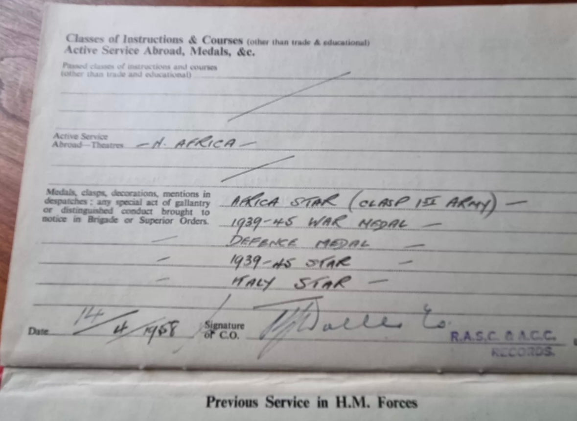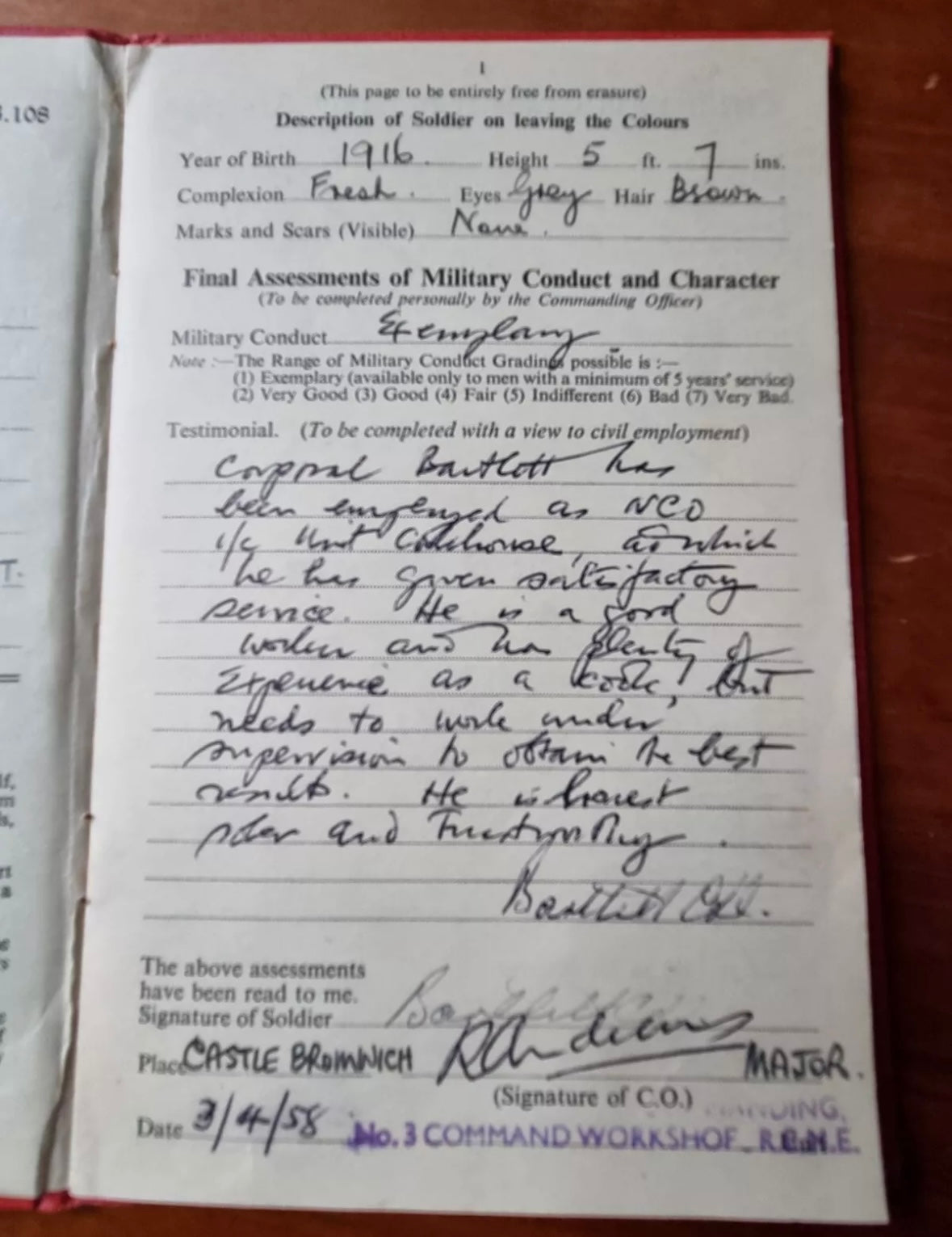 He left service on 3rd April 1958 as an Acting Corporal as a cook in the Army Catering Corps.