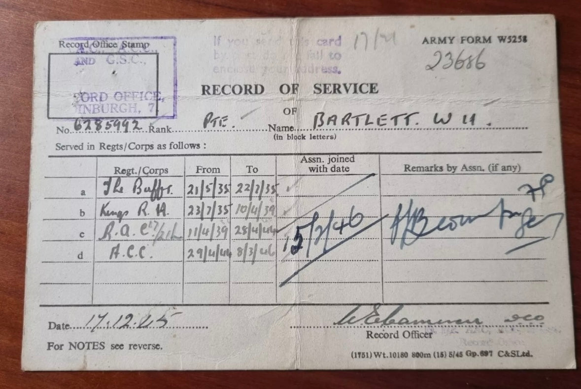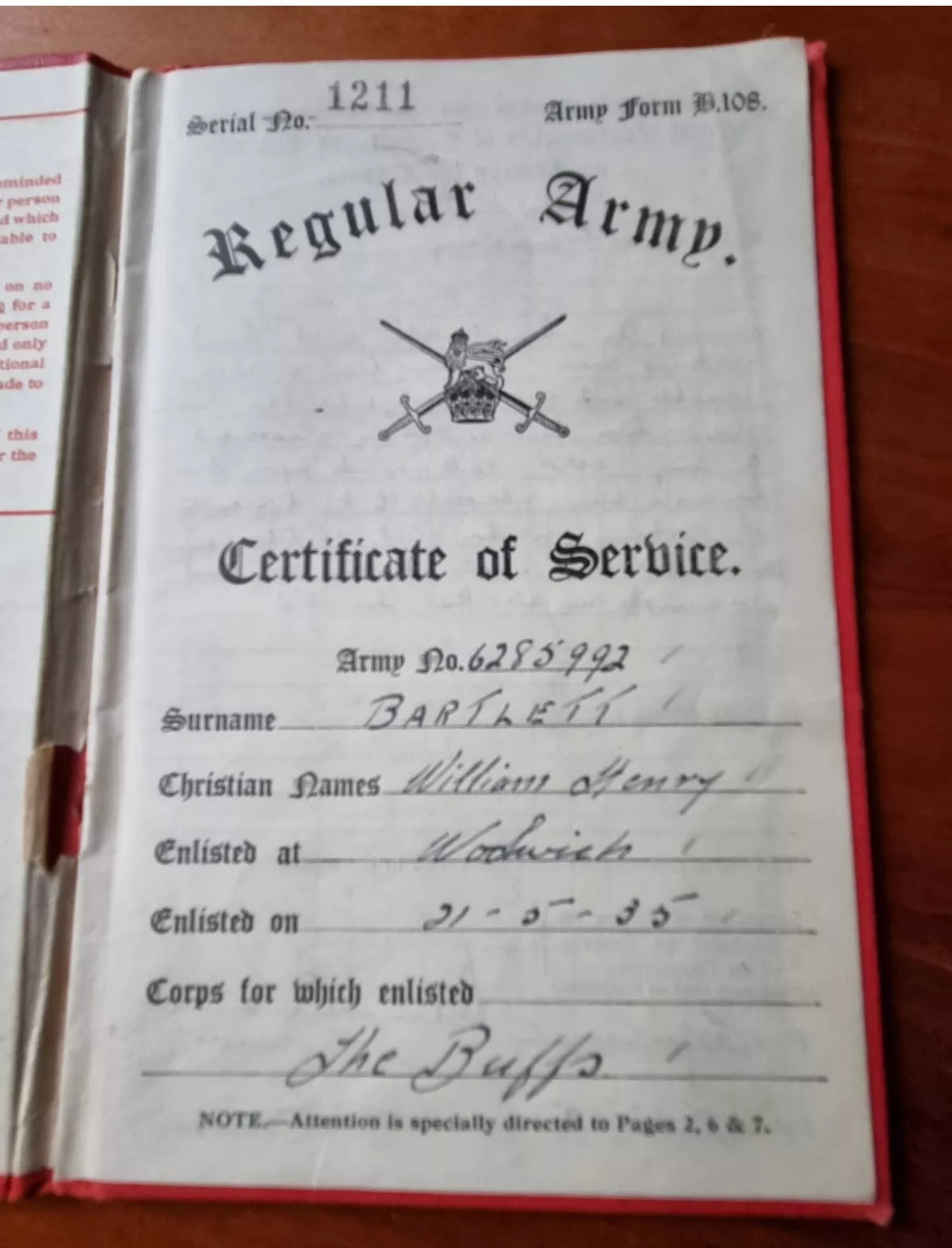 He was Born 1916 and enlisted 22th May 1935 at Woolwich into the Royal East Kent Regt (The Buffs).